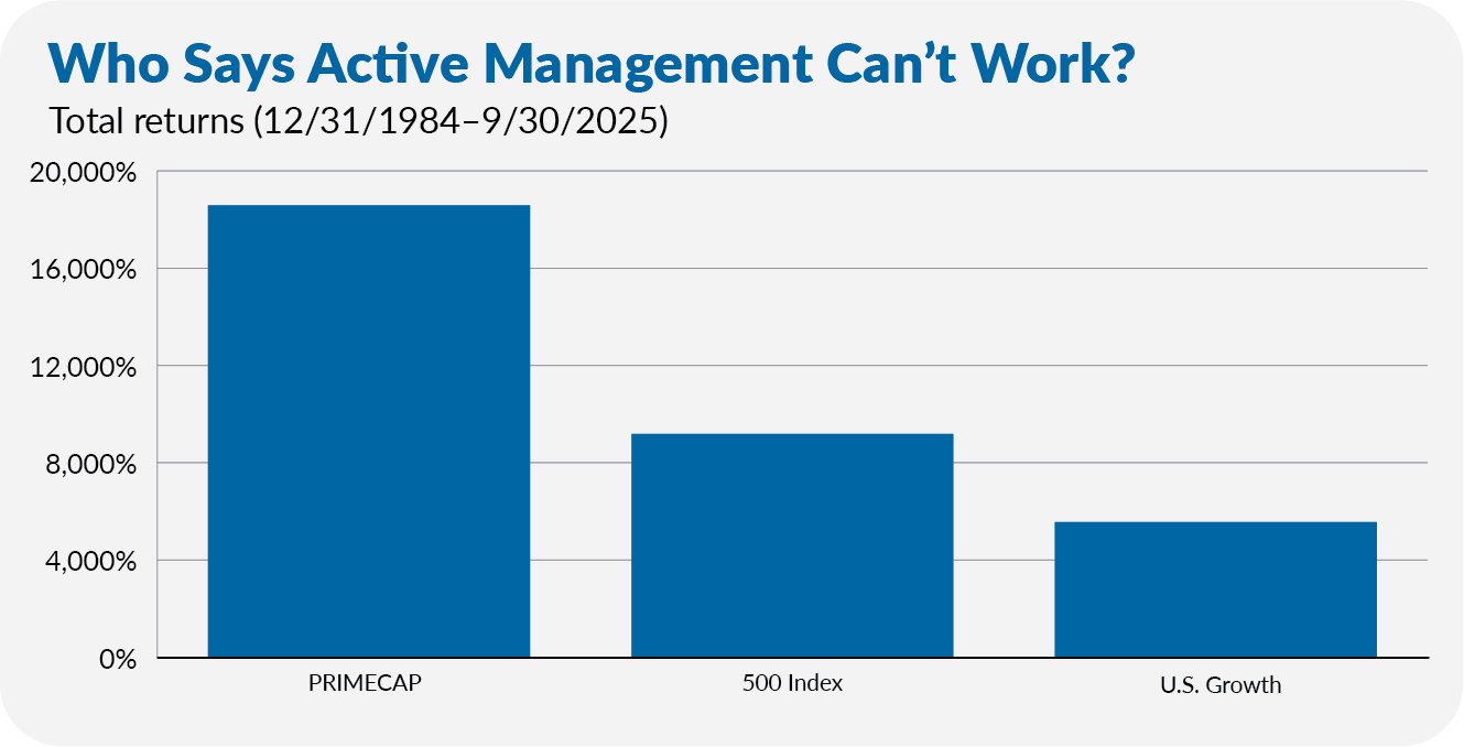 A dollar invested in 500 Index (VFINX) at the end of 1984, when PRIMECAP was launched, was worth $93 at the end of September 2025. A dollar invested in U.S. Growth (VWUSX) over that period would be worth $57. A dollar in PRIMECAP? $187!