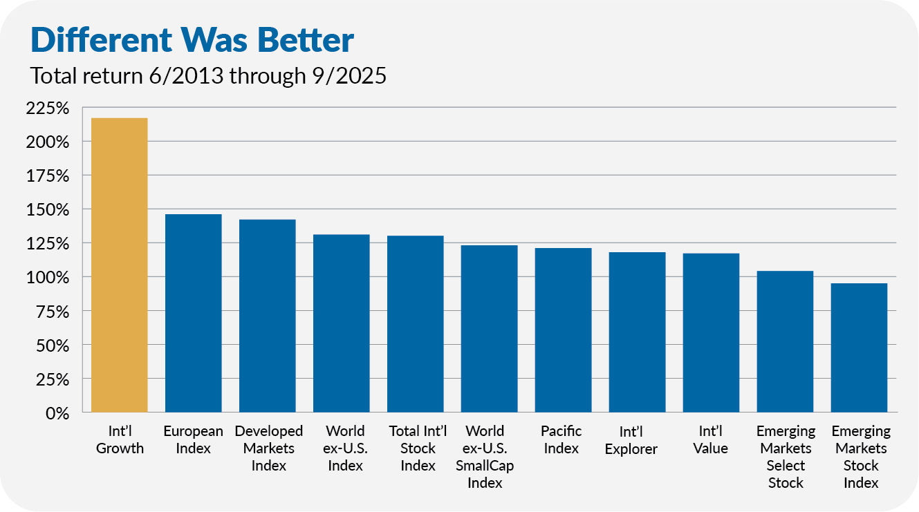 However, International Growth has been Vanguard’s best-performing foreign stock fund since I first purchased it in the Aggressive Portfolio in 2013 (through September 2025)—and it’s not even close. International Growth’s 217% gain is way ahead of the next closest fund, European Index (VEUSX), which returned 146%.