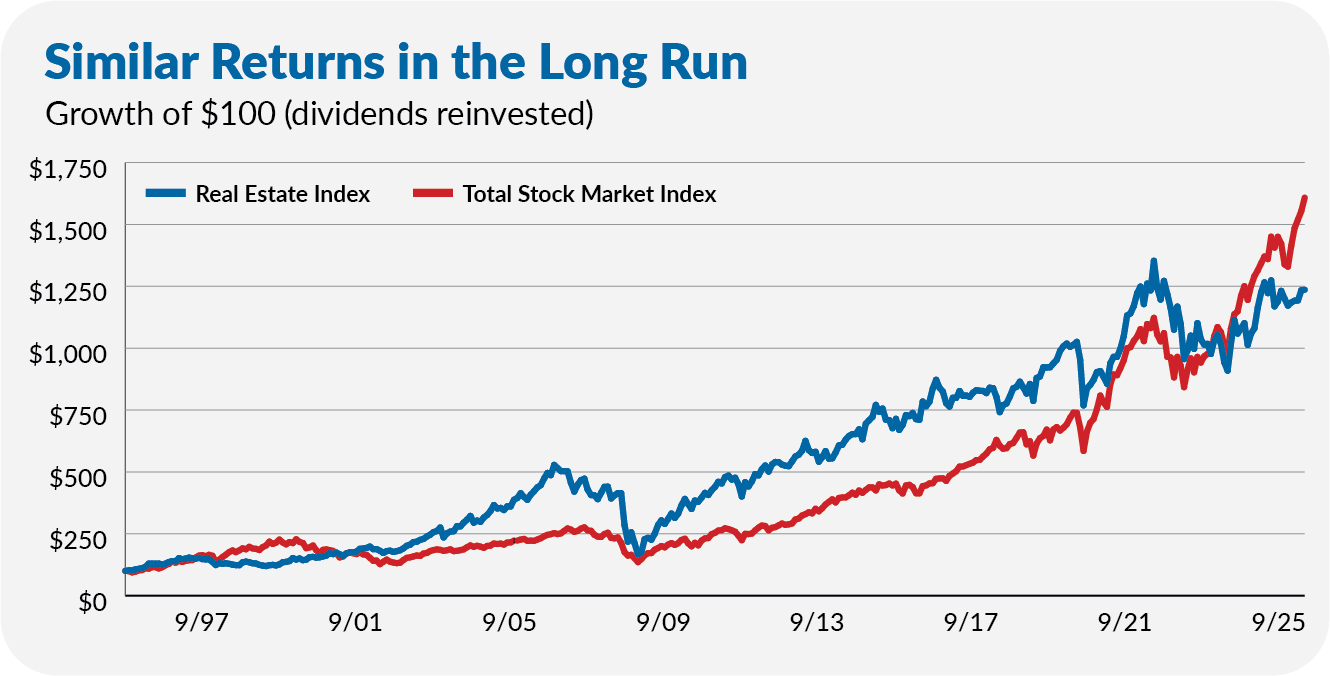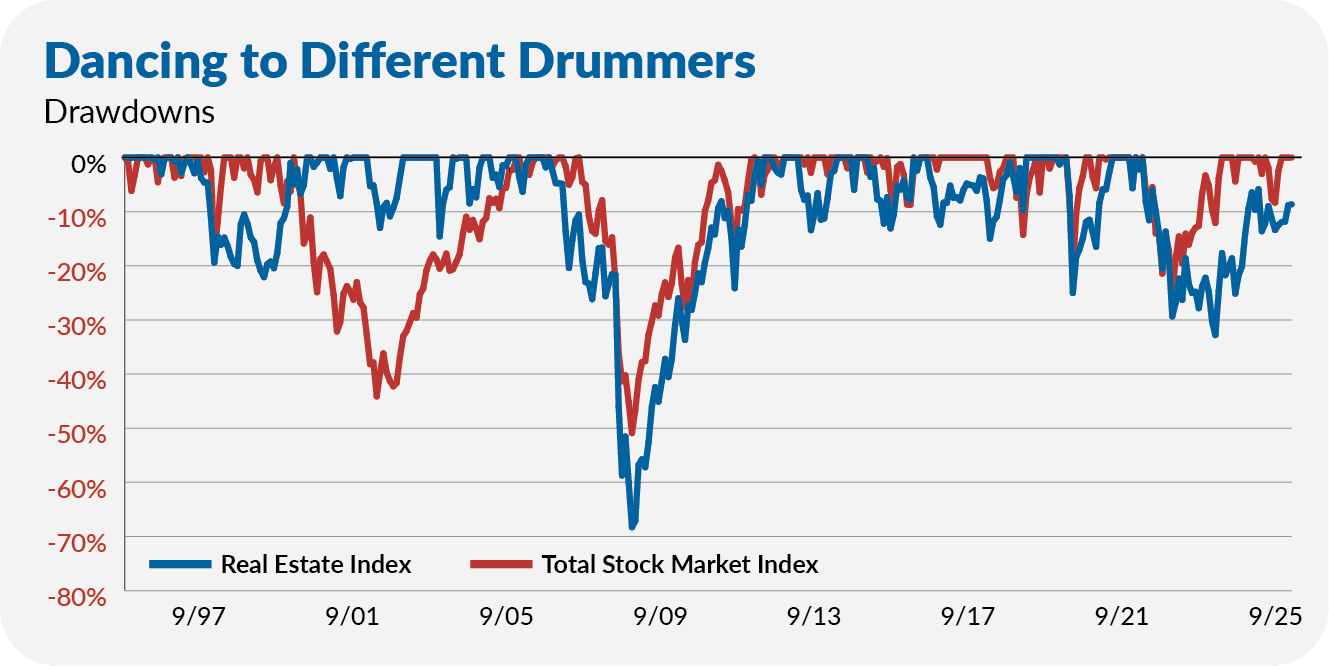 At times—like during the Global Financial Crisis and COVID-19—real estate and stocks have fallen together. But that hasn’t always been the case. For example, in the late 1990s, real estate was in a bear market (down about 20%), while stocks hit record highs. The two assets reversed positions when the tech bubble burst in 2000–2002.