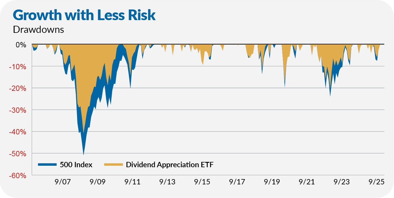 To help illustrate Dividend Appreciation ETF’s ability to protect on the downside, consider the chart below comparing the dividend fund’s drawdowns (a decline from a prior high) over time to 500 Index’s drawdowns.