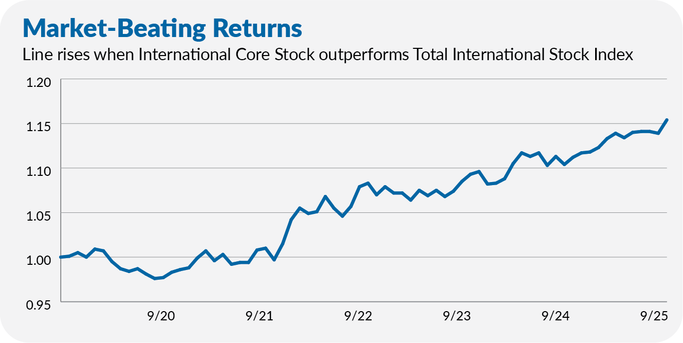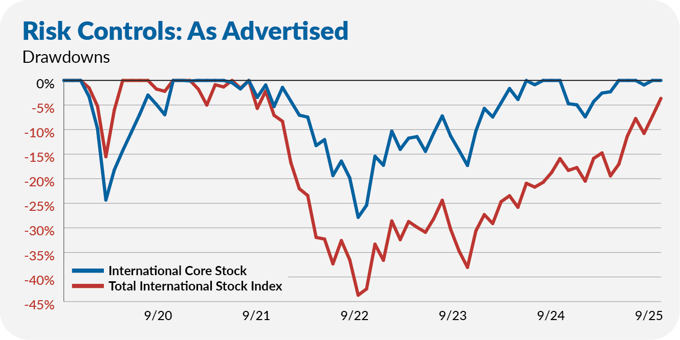 Well, since its launch through September 2025, International Core Stock has outperformed Total International Stock Index (VTIAX) by 2.7% per year. It’s mainly won by controlling risk.