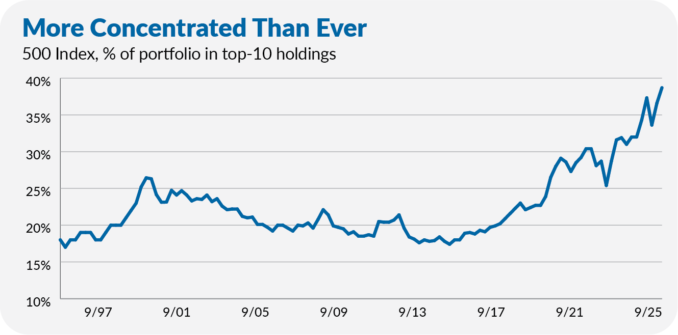 Why? The index has never been more reliant on just a handful of companies. At the end of September 2025, nearly 40% of 500 Index’s portfolio was invested in just the ten largest stocks. That’s a record over the past (nearly) three decades my data covers.