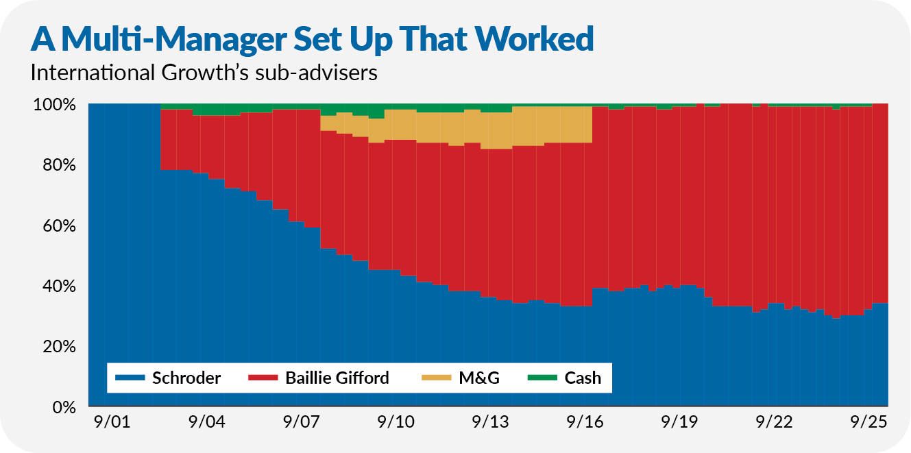 Schroders Investment Management was International Growth’s original manager. In 2003, Vanguard added Baillie Gifford to the mix, handing the Edinburgh-based managers 20% of the fund’s assets. Over the years, Vanguard gradually transitioned more assets from Schroders toward Baillie Gifford. In 2013, Baillie Gifford was responsible for half of the fund’s assets.