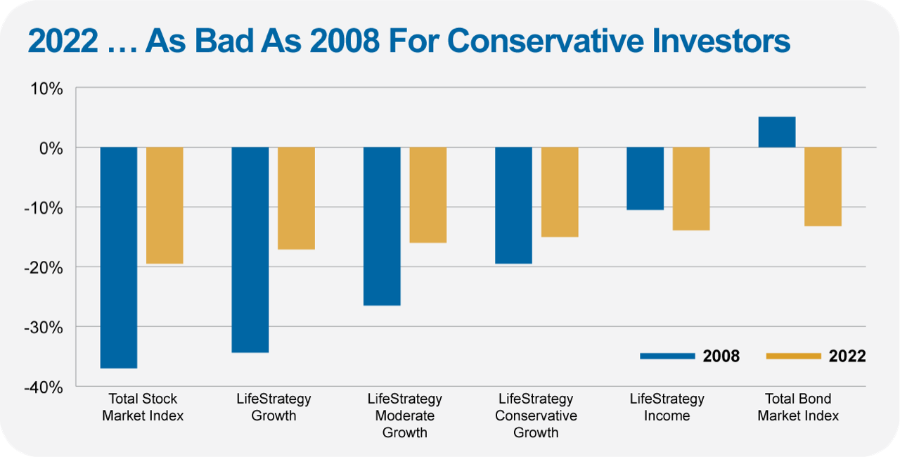 The chart below—which is probably my “chart of the year”—plots the 2022 returns for Total Stock Market Index, Total Bond Market Index (VBTLX) and the four LifeStrategy funds alongside each fund's 2008 return. As you move from left to right on the chart you move down in stock exposure and risk.