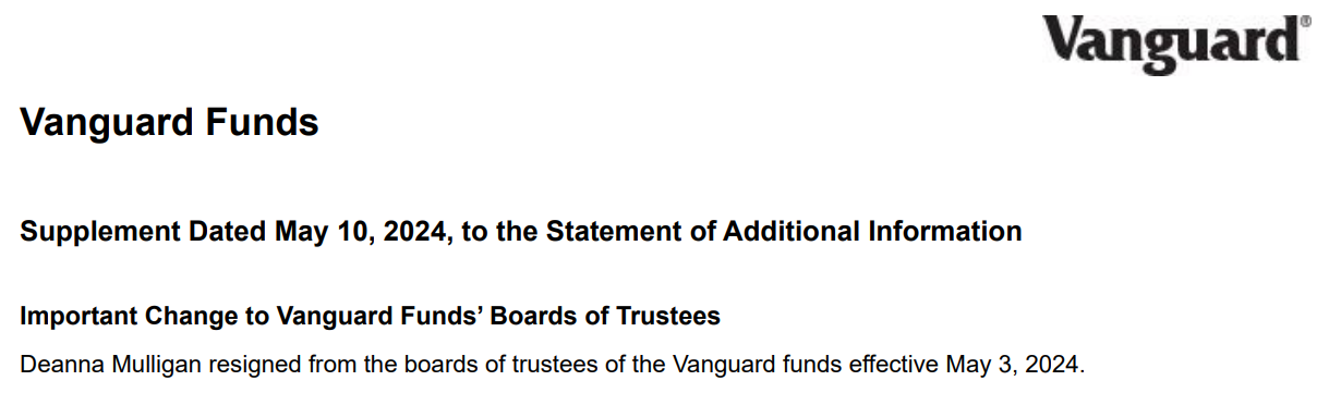 Deanna Mulligan resigned from Vanguard's board of trustees after just six years at the table—she joined at the start of 2018. Her resignation was effective May 3, though the supplements to the funds' Statement of Additional Information (SAI) were updated a week later on May 10.