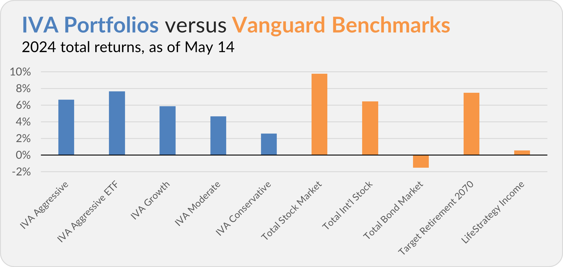 This compares to a 9.8% gain for Total Stock Market Index (VTSAX), a 6.5% return for Total International Stock Index (VTIAX), and a 1.5% decline for Total Bond Market Index (VBTLX). Vanguard's most aggressive multi-index fund, Target Retirement 2070 (VSNVX), is up 7.5% for the year, and its most conservative, LifeStrategy Income (VASIX), is up 0.5%.