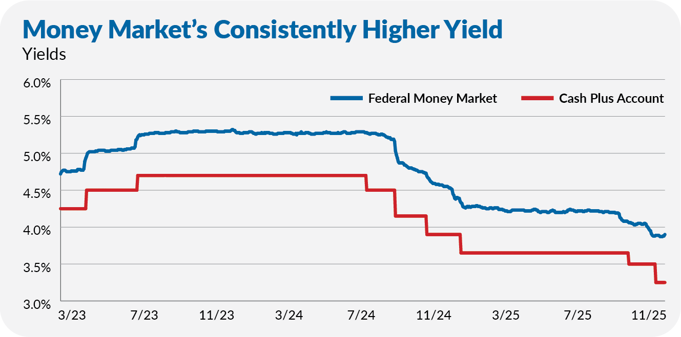 Executive Summary: Cash Plus offers FDIC insurance and spending features, but its yield lags Federal Money Market by about 0.60%. This analysis breaks down what savers are paying for and what they’re giving up with Cash Plus, and why the higher-yielding money market fund remains the stronger choice for most.