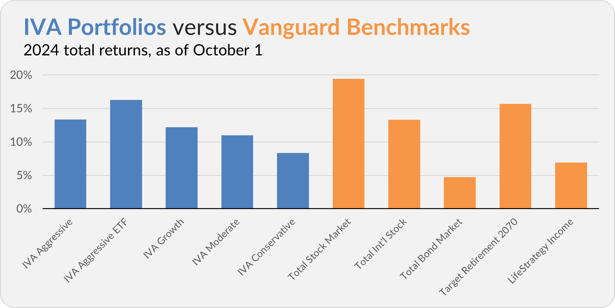 This compares to a 19.4% gain for Total Stock Market Index (VTSAX), a 13.3% return for Total International Stock Index (VTIAX), and a 4.7% gain for Total Bond Market Index (VBTLX). Vanguard’s most aggressive multi-index fund, Target Retirement 2070 (VSNVX), is up 15.7% for the year, and its most conservative, LifeStrategy Income (VASIX), is up 6.9%.