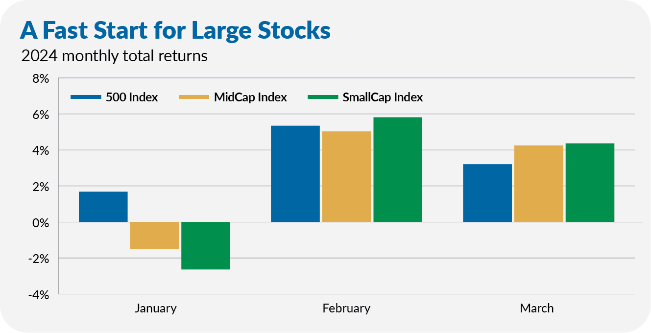 Yes, 500 Index (VFIAX) is still leading the pack for the year. The flagship index fund’s 10.5% return is ahead of MidCap Index’s 7.9% gain and SmallCap Index’s 7.5% advance. But, as you can see in the chart below showing the monthly returns of each index fund this year, 500 Index’s edge was gained in January. In other words, the bull market is broadening out a bit.
