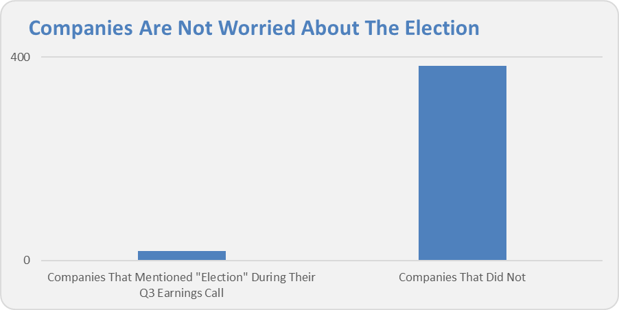 I remind myself that companies, or their managers, simply aren’t that worried about election results—or at least they aren’t talking about them. According to financial data provider FactSet, executives at just 18 (4%) of the 401 companies in the S&P 500 which reported third quarter earnings between September 15 and November 3 mentioned the word “election.” As divisive and noisy as this election season has been, the data is on par with past mid-term election cycles.