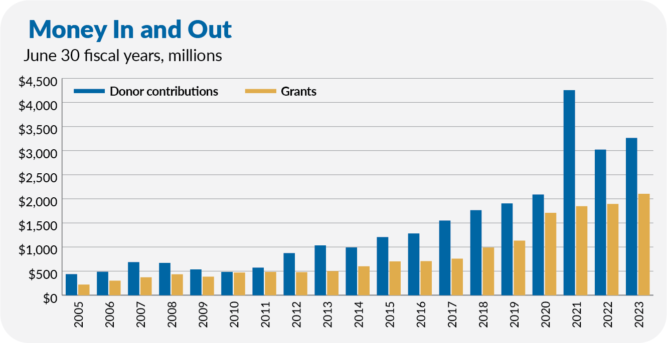 And attract money it has! Since registering with the Internal Revenue Service in December 1997, VCEP has grown dramatically. Donors have contributed more than $3 billion in each of the last three years. In the fiscal year ending in June 2023, VCEP held nearly $17 billion—up from about $15 billion at the end of June 2022.