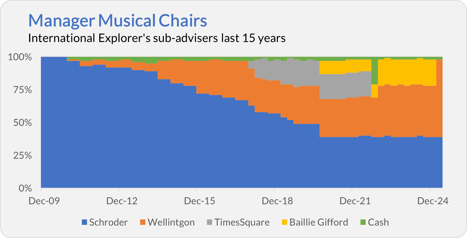 Though Vanguard is usually a patient partner, neither TimesSquare nor Ballie Gifford got much of a runout—both firms were only on the job for five years or so.