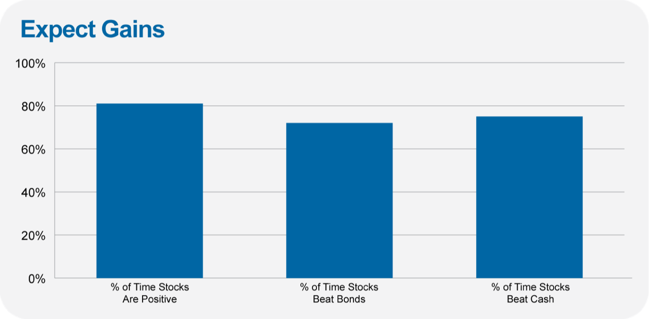 Cutting through all the numbers, your baseline expectations in any given year should be for gains; if I just say I expect the stock market to go up next year, I’ll be right about eight out of 10 times—which would be a better track record than most Wall Street forecasters can point to! Additionally, as I’ve shown, you should expect stocks to beat bonds, which in turn should outpace cash.