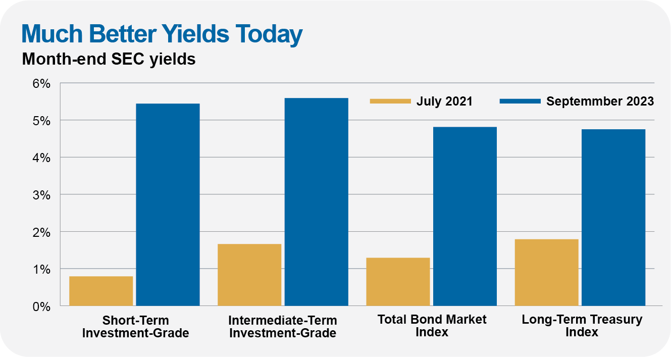 Remember, today’s bond fund yields strongly predict a fund’s return in the years ahead. As bond yields have risen (and prices have fallen) over the past 26 months, the outlook for the fixed-income markets has materially improved.