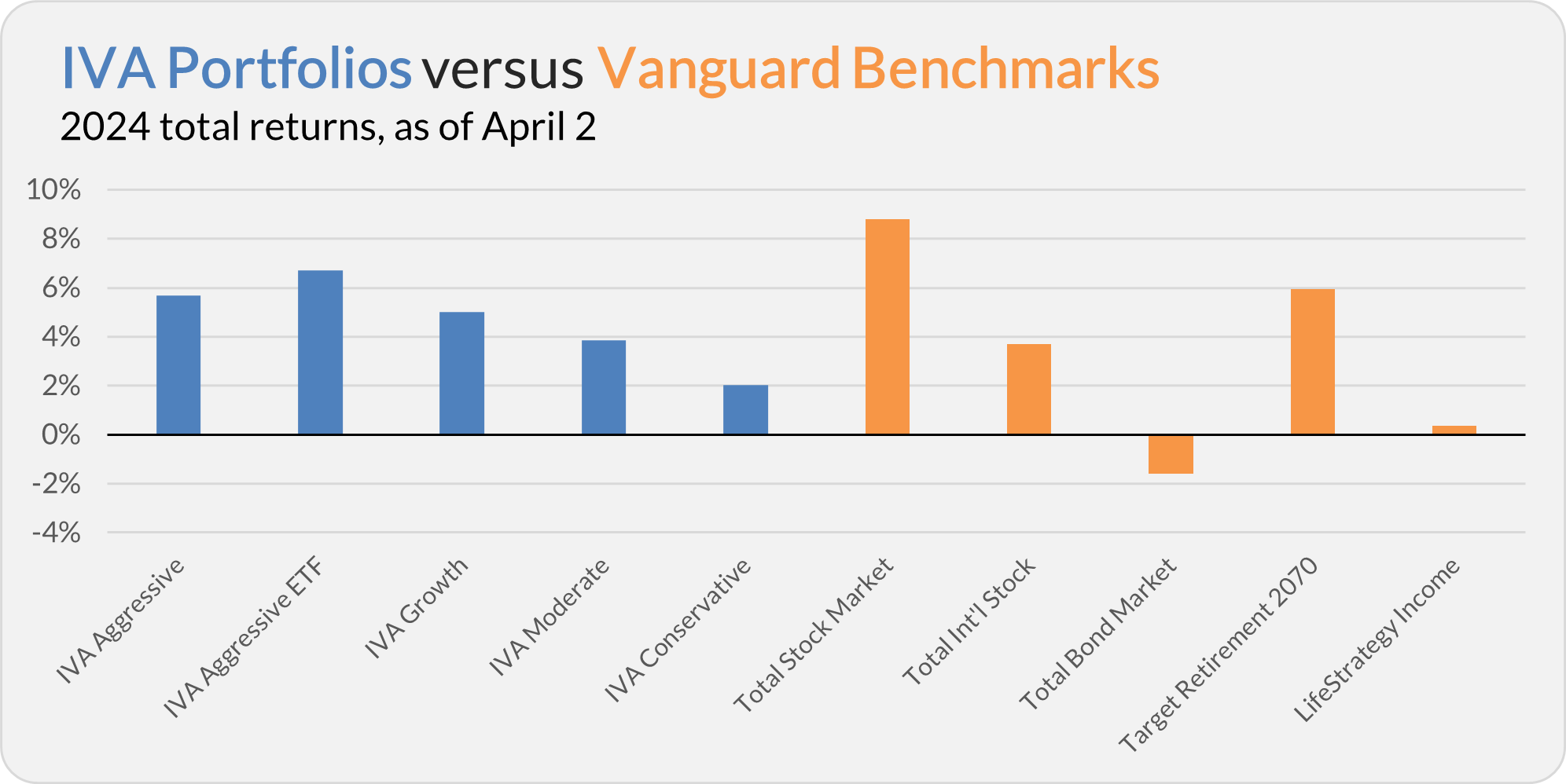 This compares to an 8.8% gain for Total Stock Market Index (VTSAX), a 3.7% return for Total International Stock Index (VTIAX), and a 1.6% decline for Total Bond Market Index (VBTLX). Vanguard’s most aggressive multi-index fund, Target Retirement 2070 (VSNVX), is up 5.9% for the year, and its most conservative, LifeStrategy Income (VASIX), is up 0.3%.