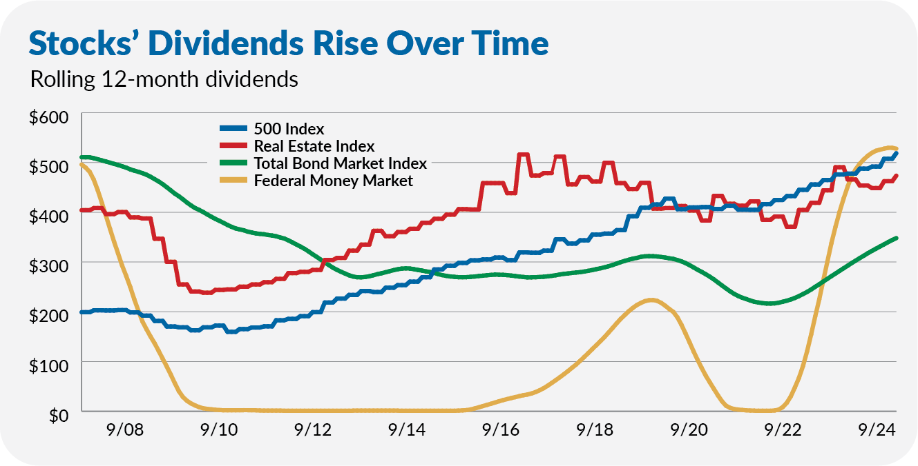 To evaluate the candidates, I started with a $10,000 investment in each fund at the end of 2006. (I chose this start date because Vanguard launched two dividend-oriented stock index funds in 2006.) I then assumed that an investor withdrew only income distributions (dividends and interest) but reinvested capital gains. I ran the analysis through September 2024.