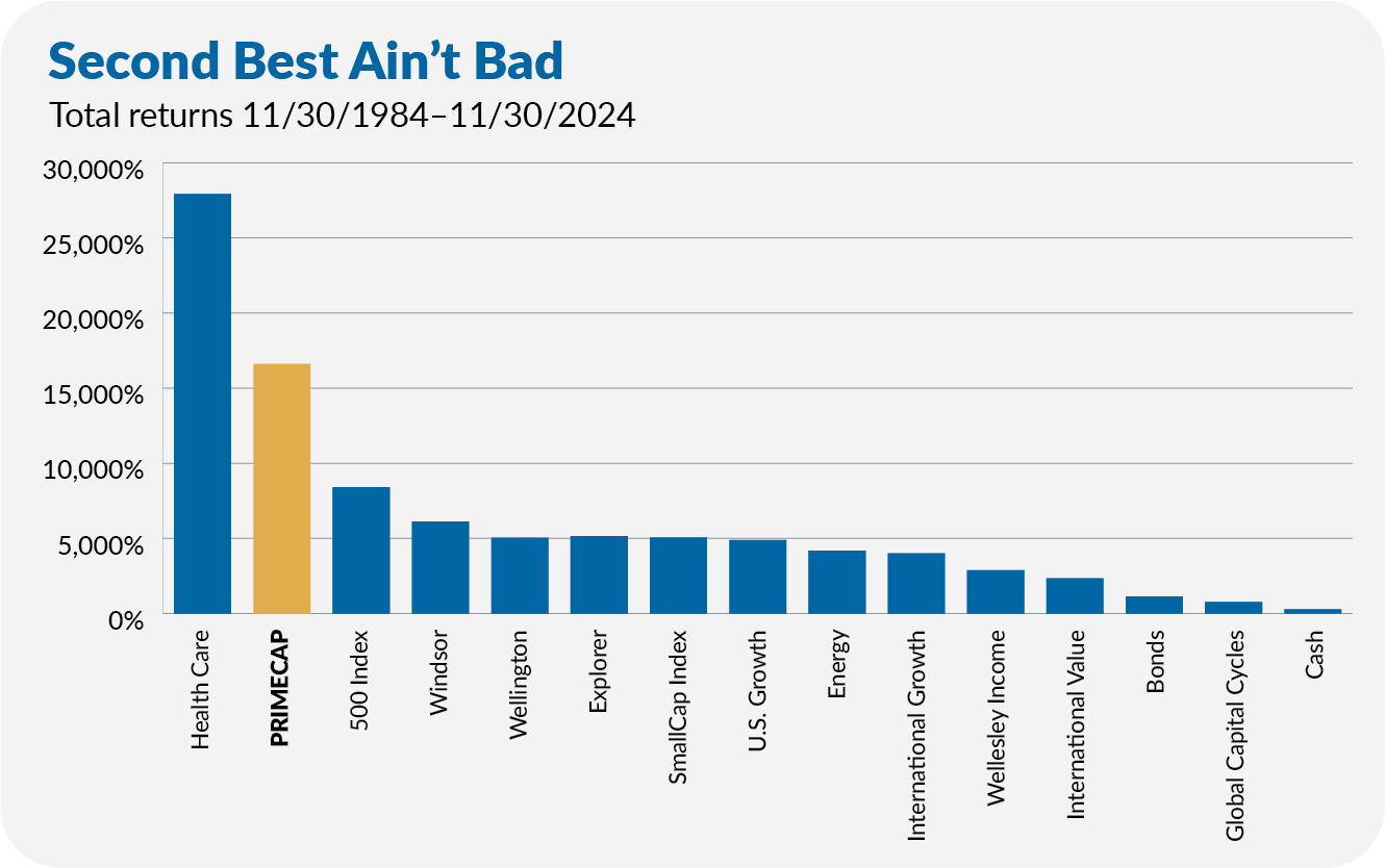 Of the 24 Vanguard funds that have existed for four decades, PRIMECAP’s 16,619% return is second only to Health Care’s (VGHCX) 27,919% return. Third on the list is 500 Index (VFINX), with an 8,402% gain.