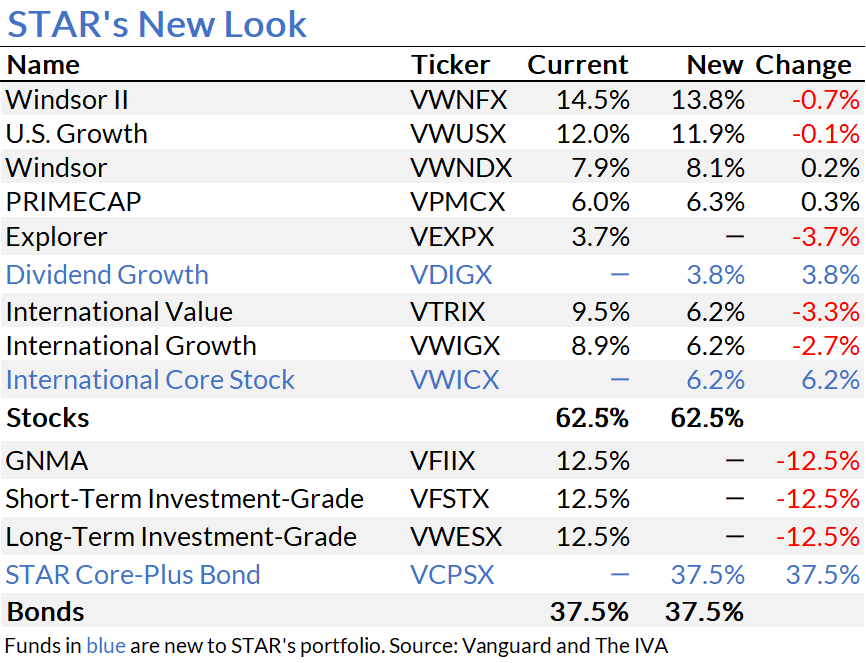 Third, Vanguard is selling all three of STAR’s bond holdings—GNMA (VFIIX), Short-Term Investment-Grade (VFSTX) and Long-Term Investment-Grade (VWESX)—to create space for the soon-to-be-launched STAR Core-Plus Bond (VCPSX).