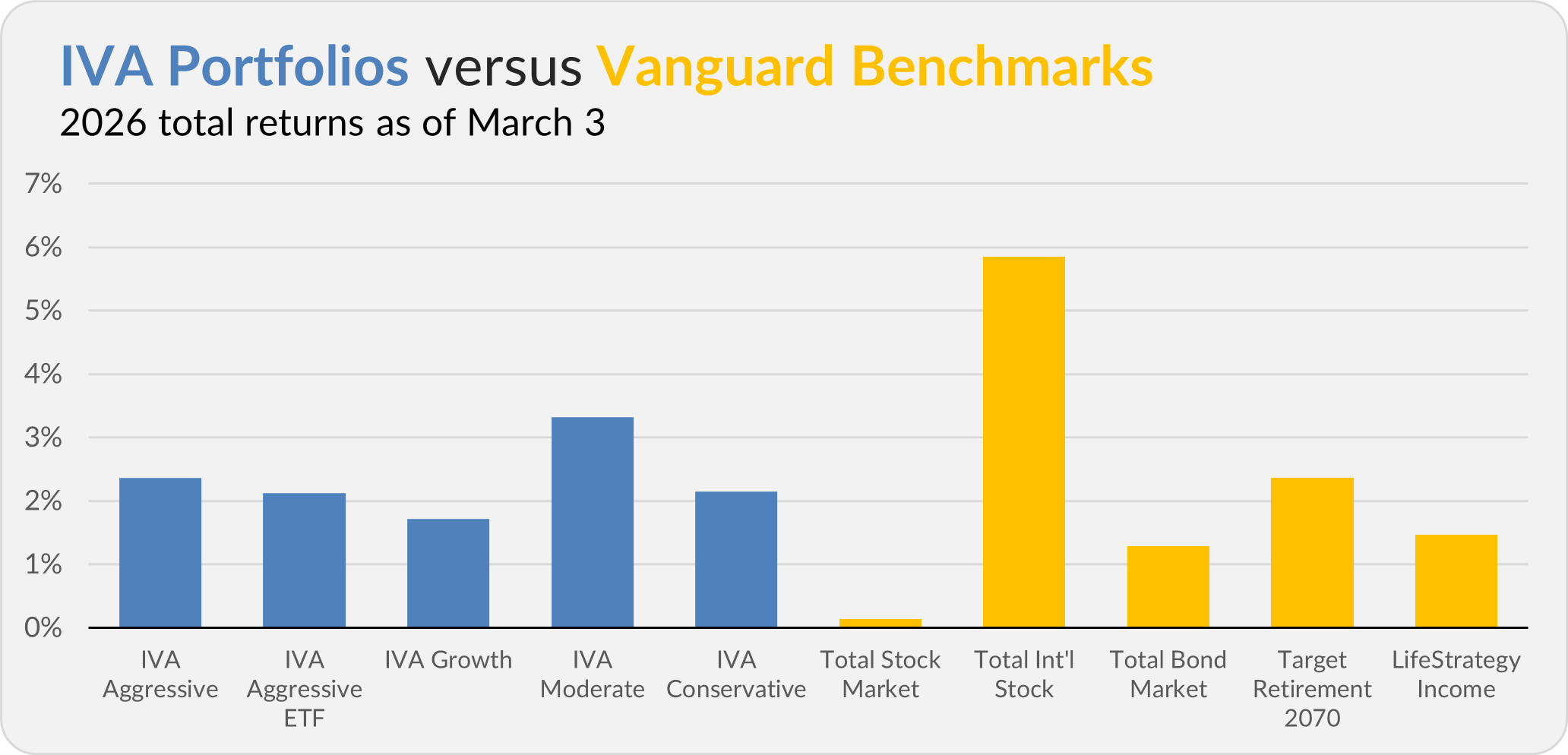 Yes, Energy ETF (VDE) gained 2.1%—no surprise when missiles are flying in the Middle East and the Strait of Hormuz, through which much of the Middle East’s oil travels, is effectively shut down. But 500 Index (VFIAX) was flat on the day, and SmallCap Index (VSMAX) gained 0.5%. Hardly the stuff of panic.