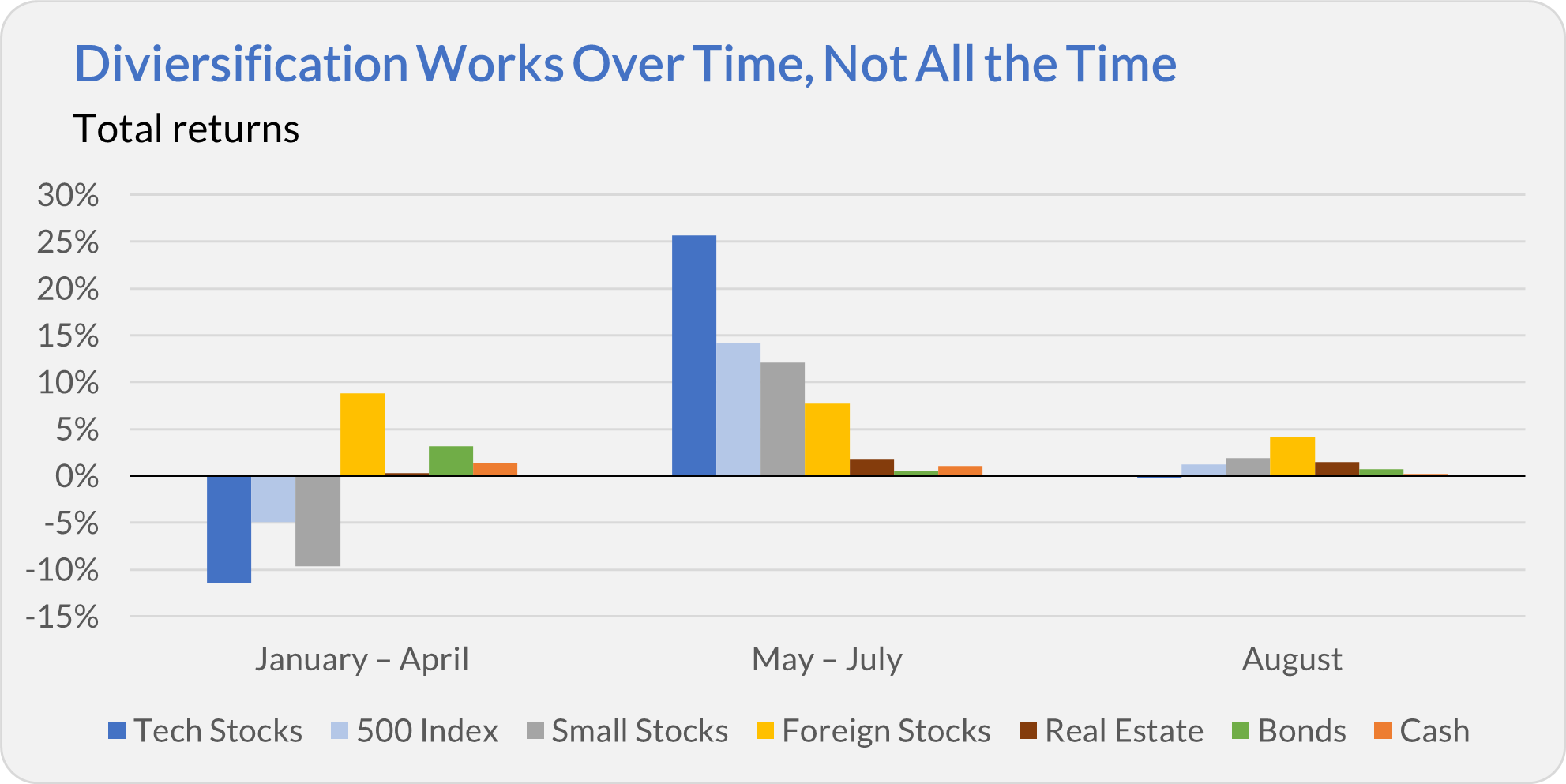 Through the first four months of the year, diversification looked like the right call. While 500 Index (VFIAX) fund fell 4.9% and Information Technology Index (VITAX) tumbled 11.4%, a broad mix of other investments posted gains. Foreign stocks, real estate, bonds and cash all delivered positive returns ranging from 0.3% and 8.8%.