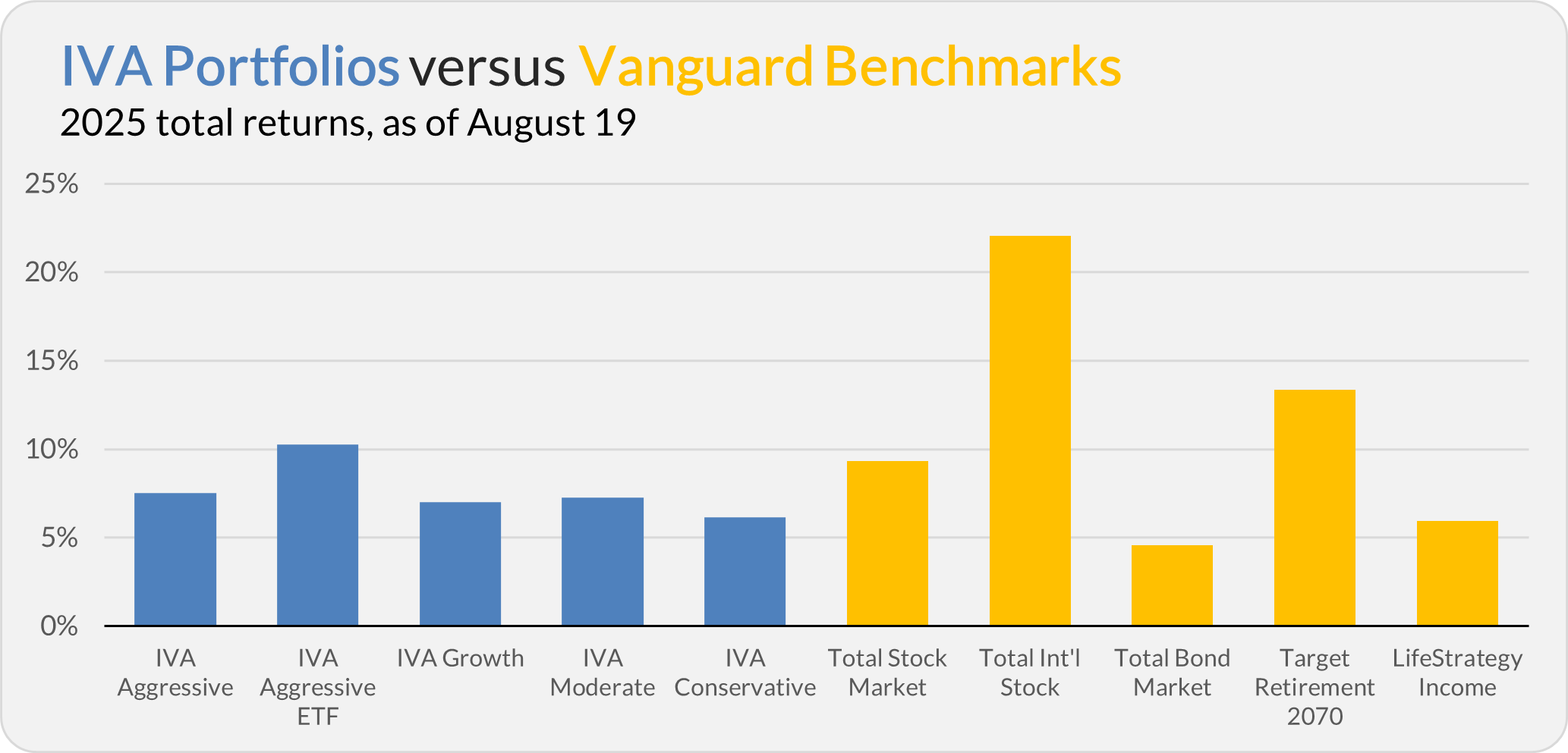 This compares to a 9.3% gain for Total Stock Market Index (VTSAX), a 22.1% return for Total International Stock Index (VTIAX), and a 4.5% gain for Total Bond Market Index (VBTLX). Vanguard’s most aggressive multi-index fund, Target Retirement 2070 (VSNVX), is up 13.3% for the year, and its most conservative, LifeStrategy Income (VASIX), is up 5.9%.