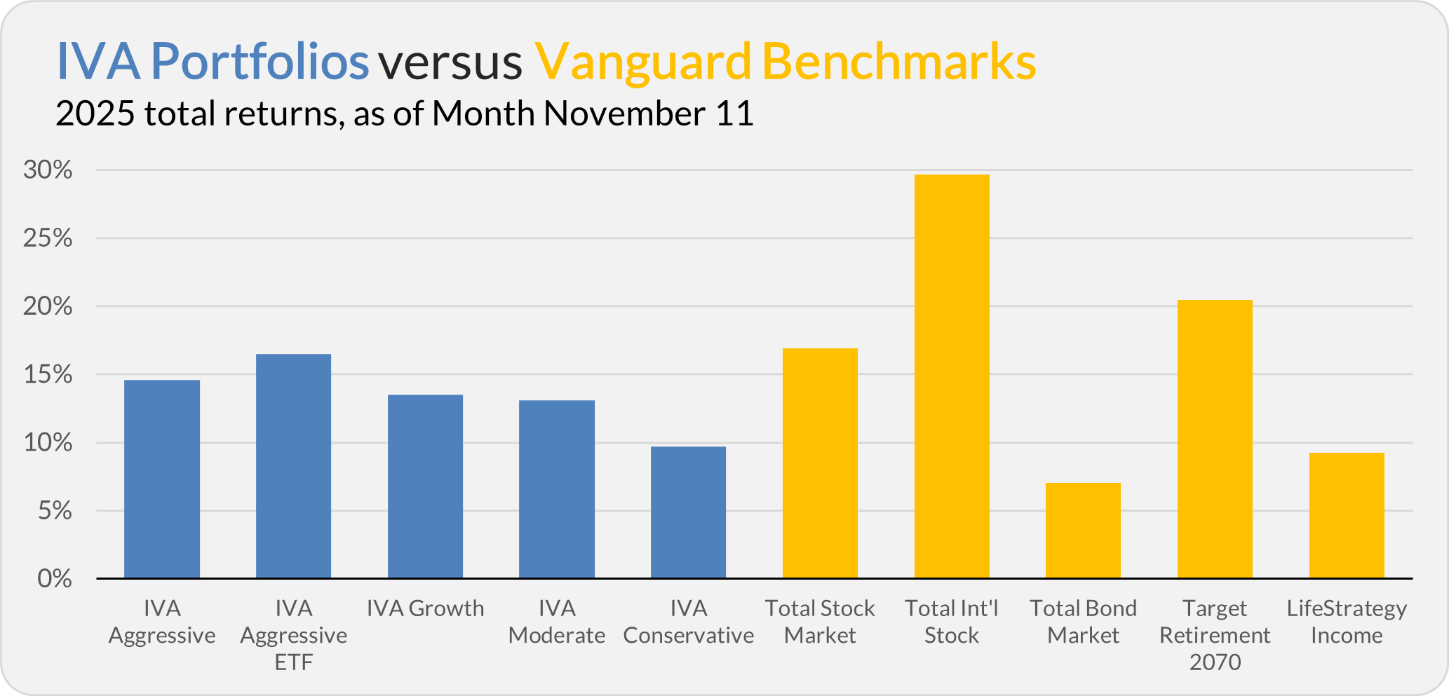 This compares to a 16.9% return for Total Stock Market Index (VTSAX), a 29.7% gain for Total International Stock Index (VTIAX), and a 7.0% return for Total Bond Market Index (VBTLX). Vanguard’s most aggressive multi-index fund, Target Retirement 2070 (VSNVX), is up 20.4% for the year, and its most conservative, LifeStrategy Income (VASIX), is up 9.2%.