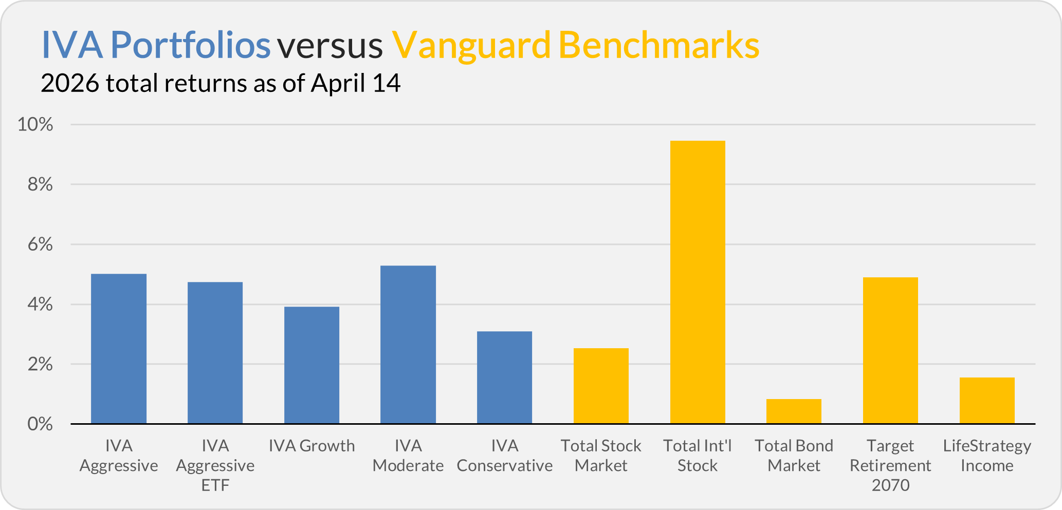 This compares to a 2.5% gain for Total Stock Market Index (VTSAX), a 9.5% return for Total International Stock Index (VTIAX), and a 0.8% gain for Total Bond Market Index (VBTLX). Vanguard’s most aggressive multi-index fund, Target Retirement 2070 (VSNVX), is up 4.9% for the year, and its most conservative, LifeStrategy Income (VASIX), is up 1.5%.