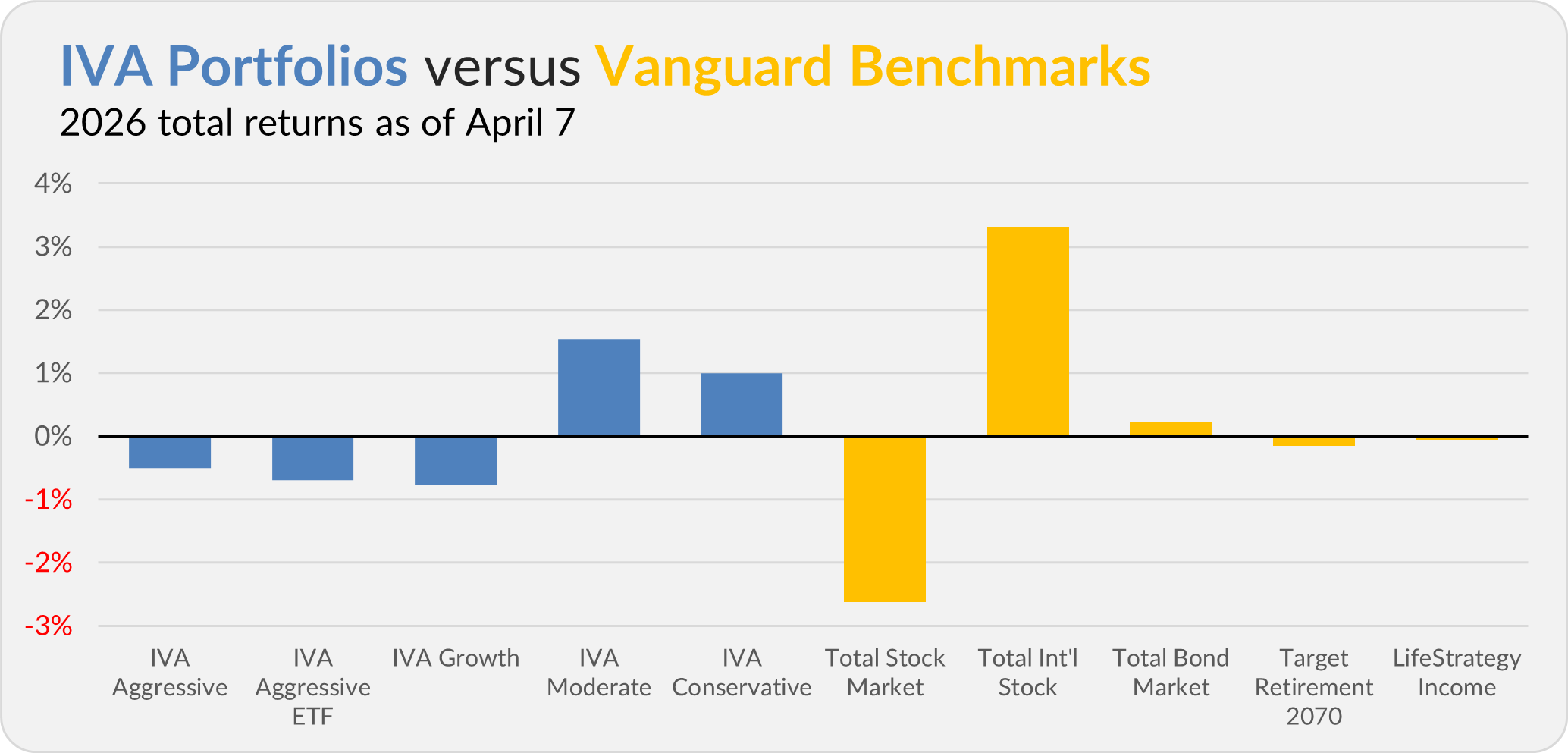 This compares to a 2.6% decline for Total Stock Market Index (VTSAX), a 3.3% gain for Total International Stock Index (VTIAX), and a 0.2% return for Total Bond Market Index (VBTLX). Vanguard’s most aggressive multi-index fund, Target Retirement 2070 (VSNVX), is down 0.2% for the year, and its most conservative, LifeStrategy Income (VASIX), is down 0.1%.