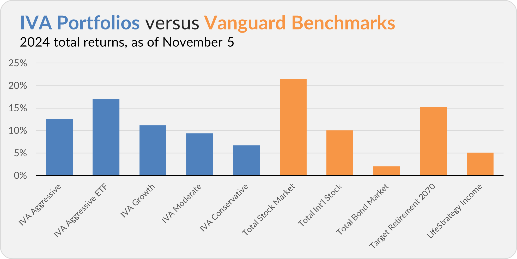 This compares to a 21.4% return for Total Stock Market Index (VTSAX), a 10.0% gain for Total International Stock Index (VTIAX), and a 2.0% return for Total Bond Market Index (VBTLX). Vanguard’s most aggressive multi-index fund, Target Retirement 2070 (VSNVX), is up 15.3% for the year, and its most conservative, LifeStrategy Income (VASIX), is up 5.1%.