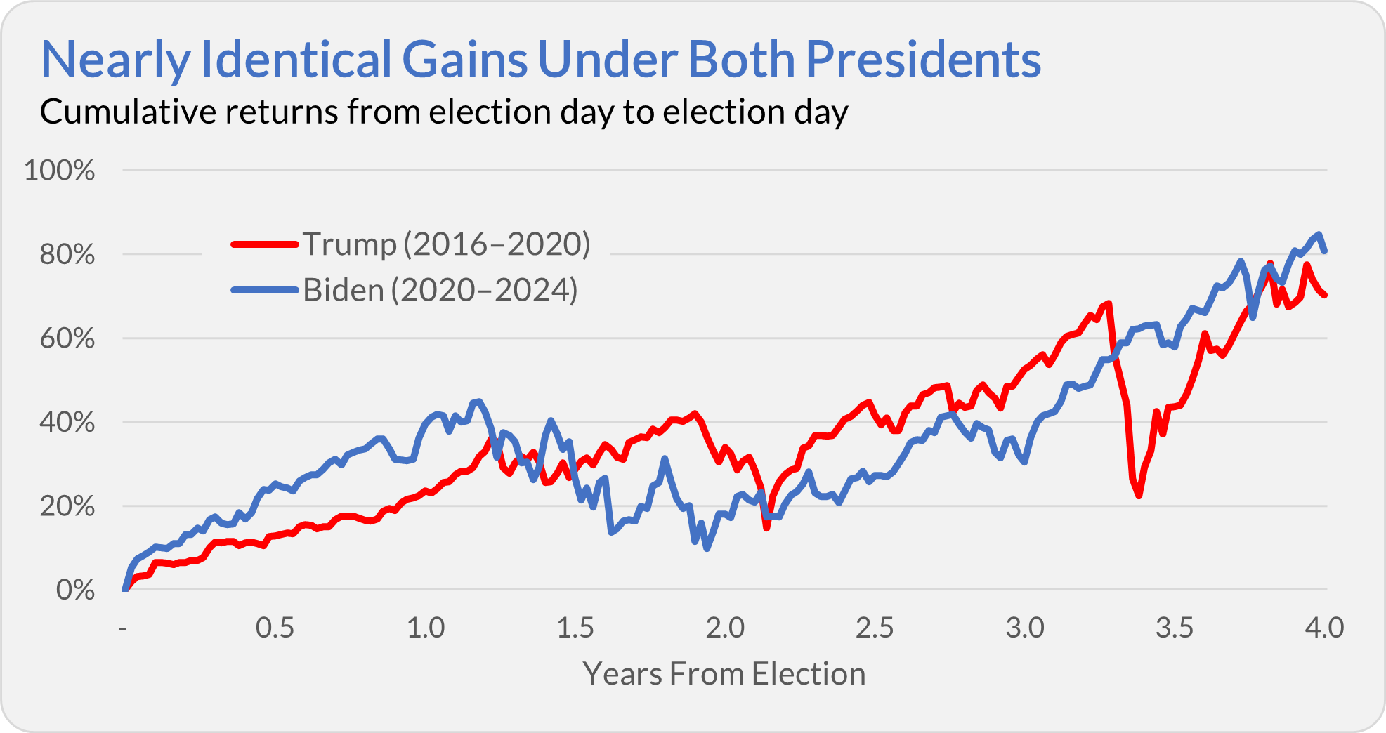 U.S. stocks delivered similar total returns under both presidents—70% during Trump’s first stint in office and 81% since Biden’s election—despite taking very different paths to get there.