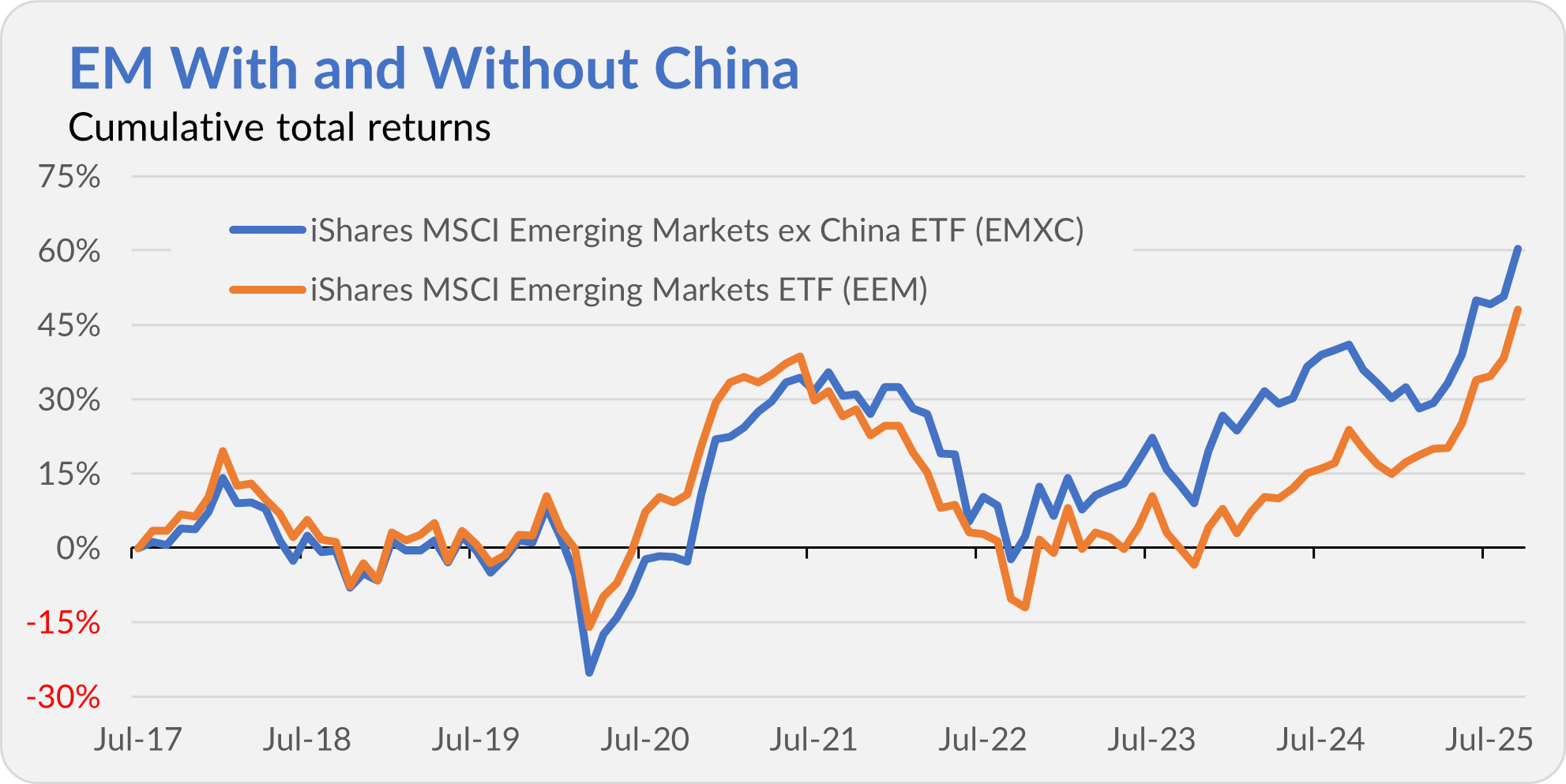 Still, over the past decade, it hasn’t been a make-or-break decision. Since iShares launched Emerging Markets ex-China ETF (EMXC) in 2017, the ex-China ETF has gained 60%, while the broader Emerging Markets ETF (EEM) is up 48%—a roughly 1% per year advantage for skipping China.