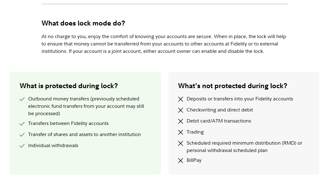 For instance, Fidelity offers a “Money Transfer Lock” feature. It allows you to toggle a security lock on individual accounts to block “major” withdrawals, while still permitting regular activity, such as bill payments, check writing and scheduled RMDs. It’s a smart balance between security and convenience.