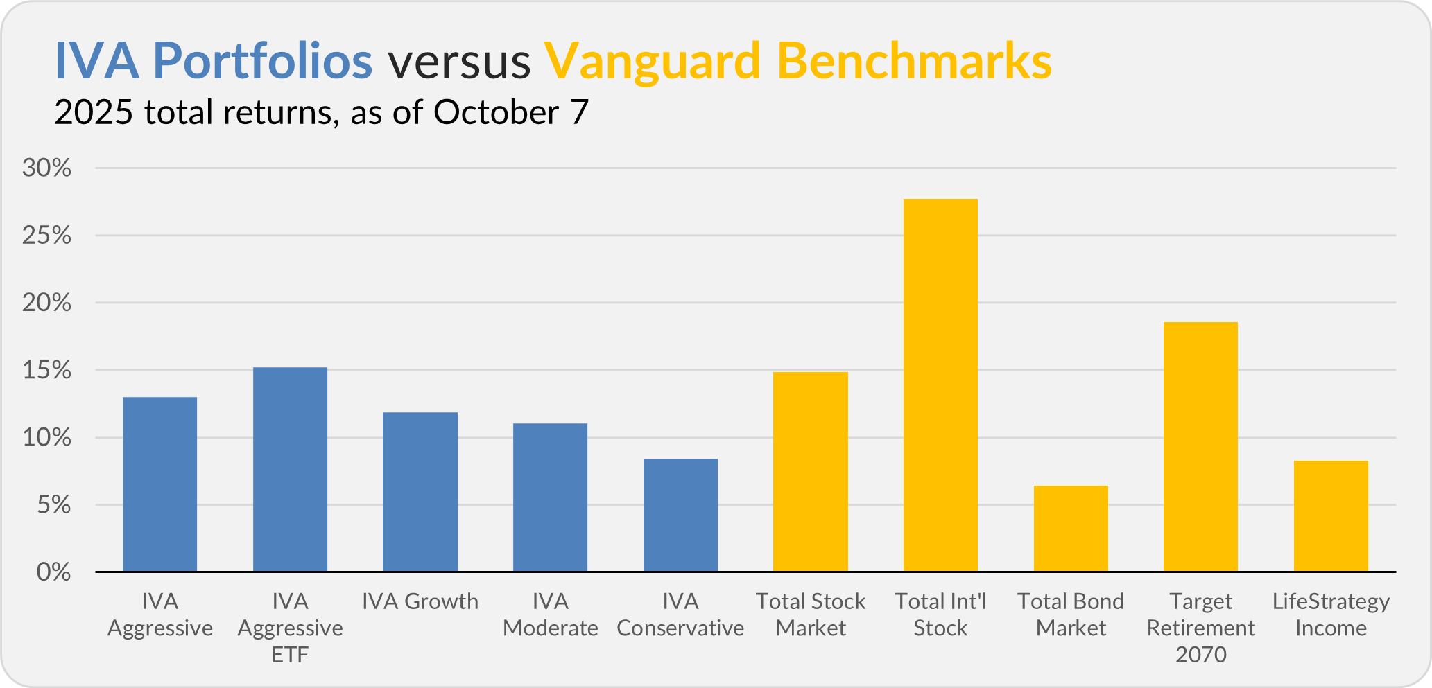 This compares to a 14.8% return for Total Stock Market Index (VTSAX), a 27.7% gain for Total International Stock Index (VTIAX), and a 6.4% return for Total Bond Market Index (VBTLX). Vanguard’s most aggressive multi-index fund, Target Retirement 2070 (VSNVX), is up 18.5% for the year, and its most conservative, LifeStrategy Income (VASIX), is up 8.3%.