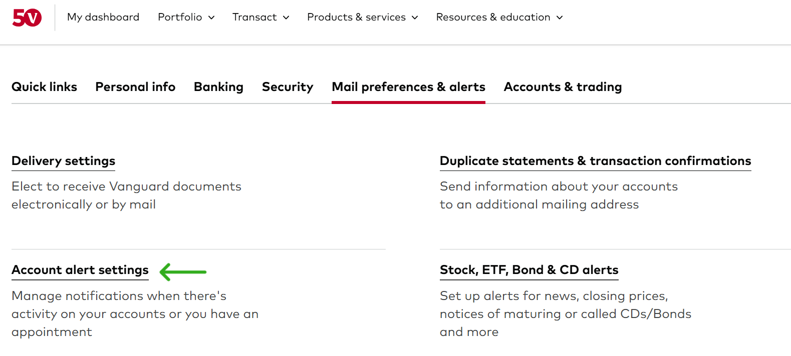 You can manage the alerts you receive by logging into your Vanguard account and clicking on your profile. You’ll then want to navigate to the “Mail preferences & alerts” section. Then go to the “Account alert settings” (the green arrow in the screenshot below).