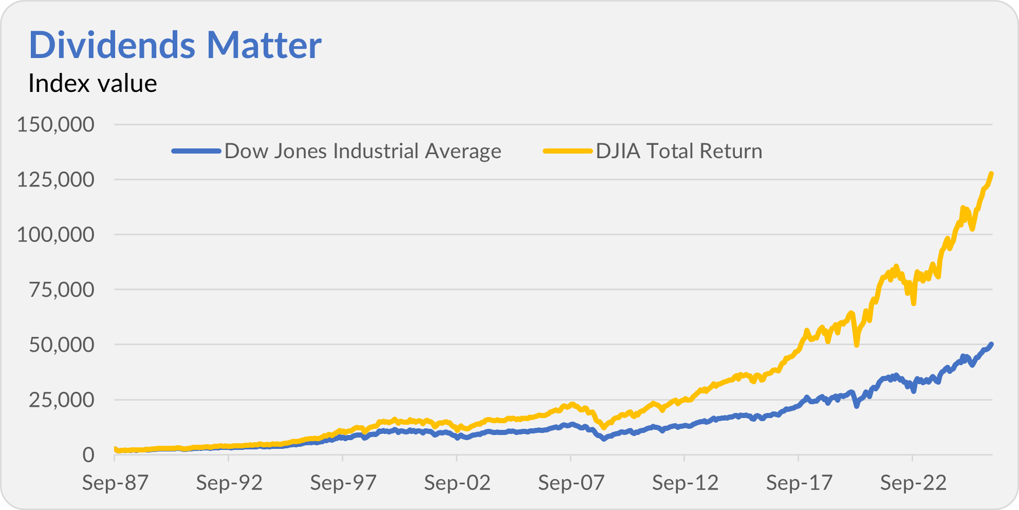 And there’s another wrinkle: Those headline Dow figures don’t include dividends. Add dividends back in, and the Dow effectively blew past 50,000 years ago—in 2017. The Dow’s total return index is already north of 125,000.