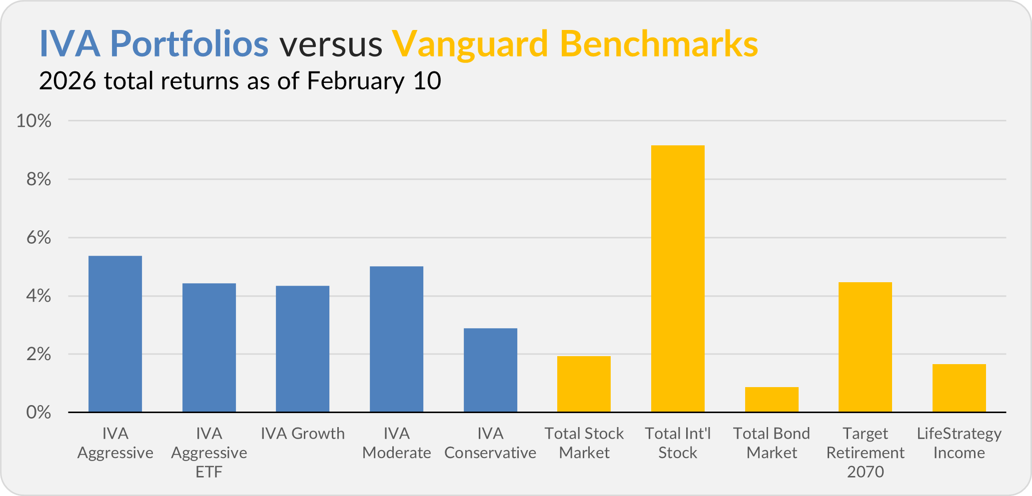 This compares to a 1.9% gain for Total Stock Market Index (VTSAX), a 9.2% return for Total International Stock Index (VTIAX), and a 0.9% gain for Total Bond Market Index (VBTLX). Vanguard’s most aggressive multi-index fund, Target Retirement 2070 (VSNVX), is up 4.5% for the year, and its most conservative, LifeStrategy Income (VASIX), is up 1.6%.