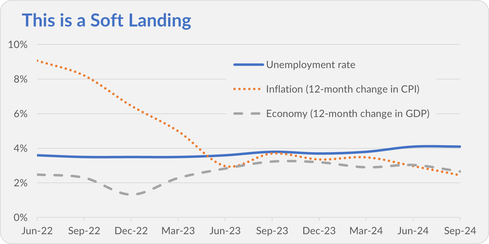 Putting it all together, over the 12 months ending September 2024, the economy grew 2.7% (after inflation), while inflation (measured by CPI) fell from 3.7% to 2.4%, and the unemployment rate rose from 3.8% to 4.1%. That’s a soft landing in my book.