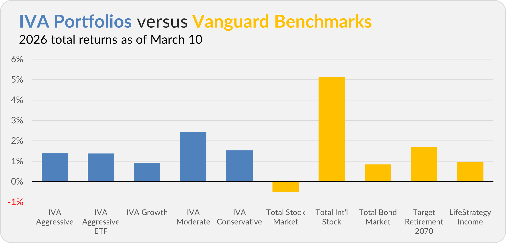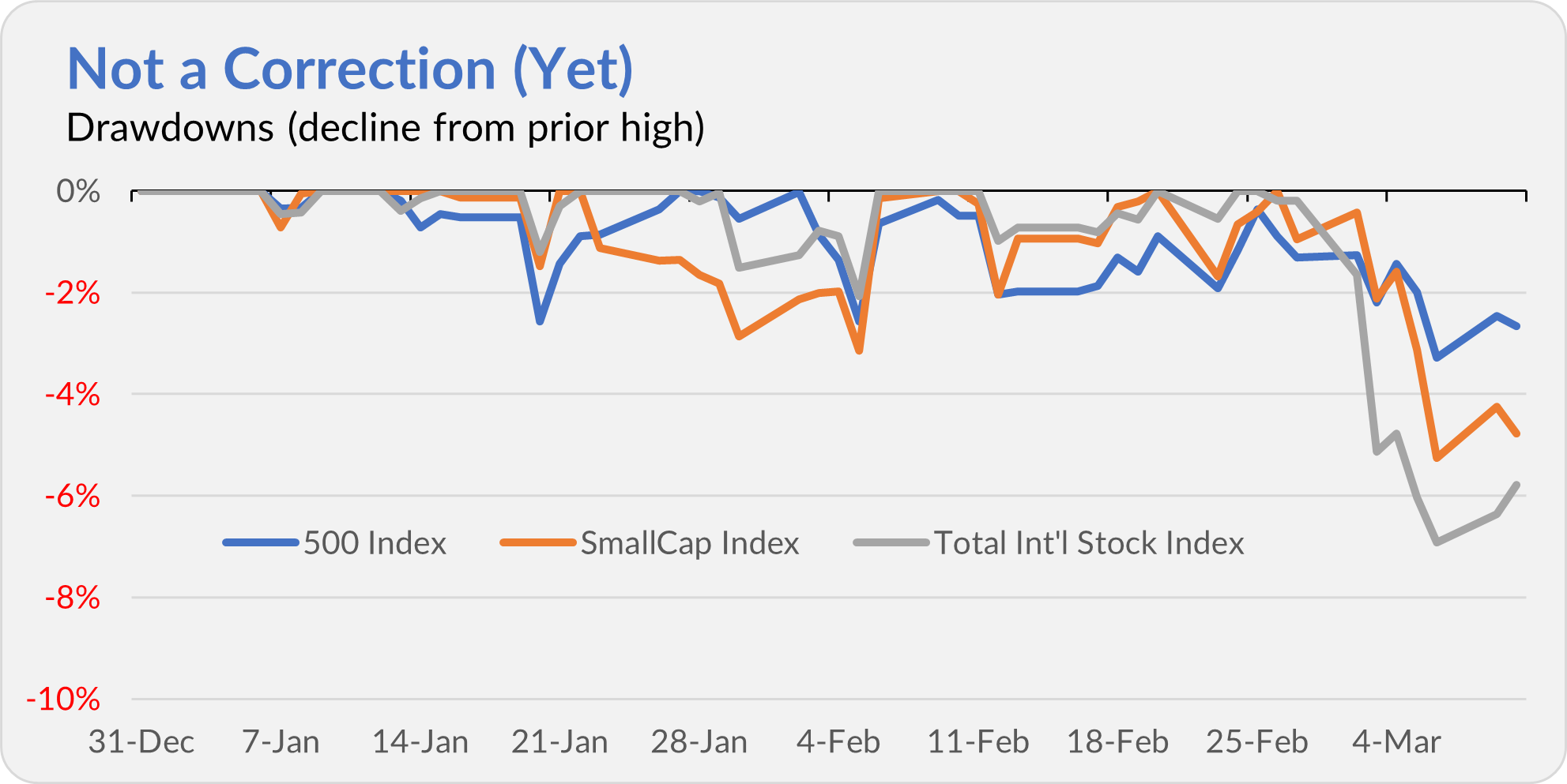500 Index (VFIAX), for example, is down just 1.4% in March and sits only 2.7% below its January 27 peak. At its worst, the flagship index fund was 3.3% below its prior high. That’s not even a pullback—typically defined as a decline of 5% to 10%.