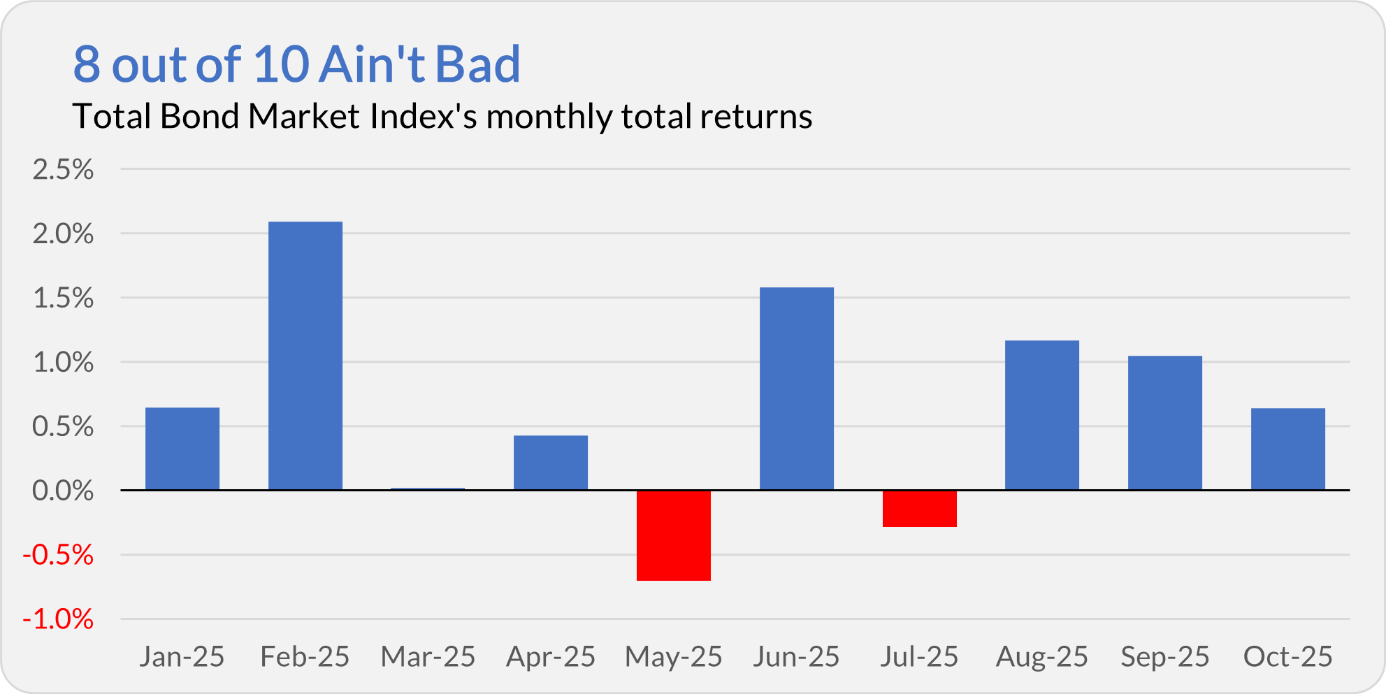 Consider Total Bond Market Index (VBTLX), which has delivered positive returns in eight out of ten months this year—up 6.8% through October.