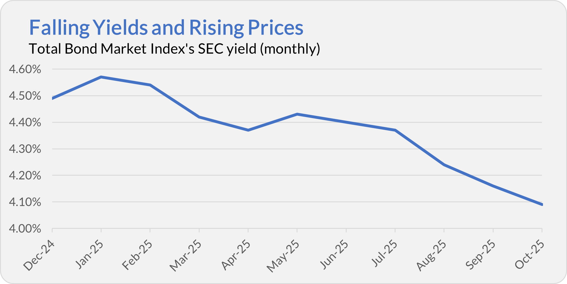The fund started 2025 yielding 4.49%, setting the stage for decent returns. Its 6.8% year-to-date gain outpaces that starting yield because yields have since declined to 4.09%. Remember: when bond yields fall, bond prices rise.