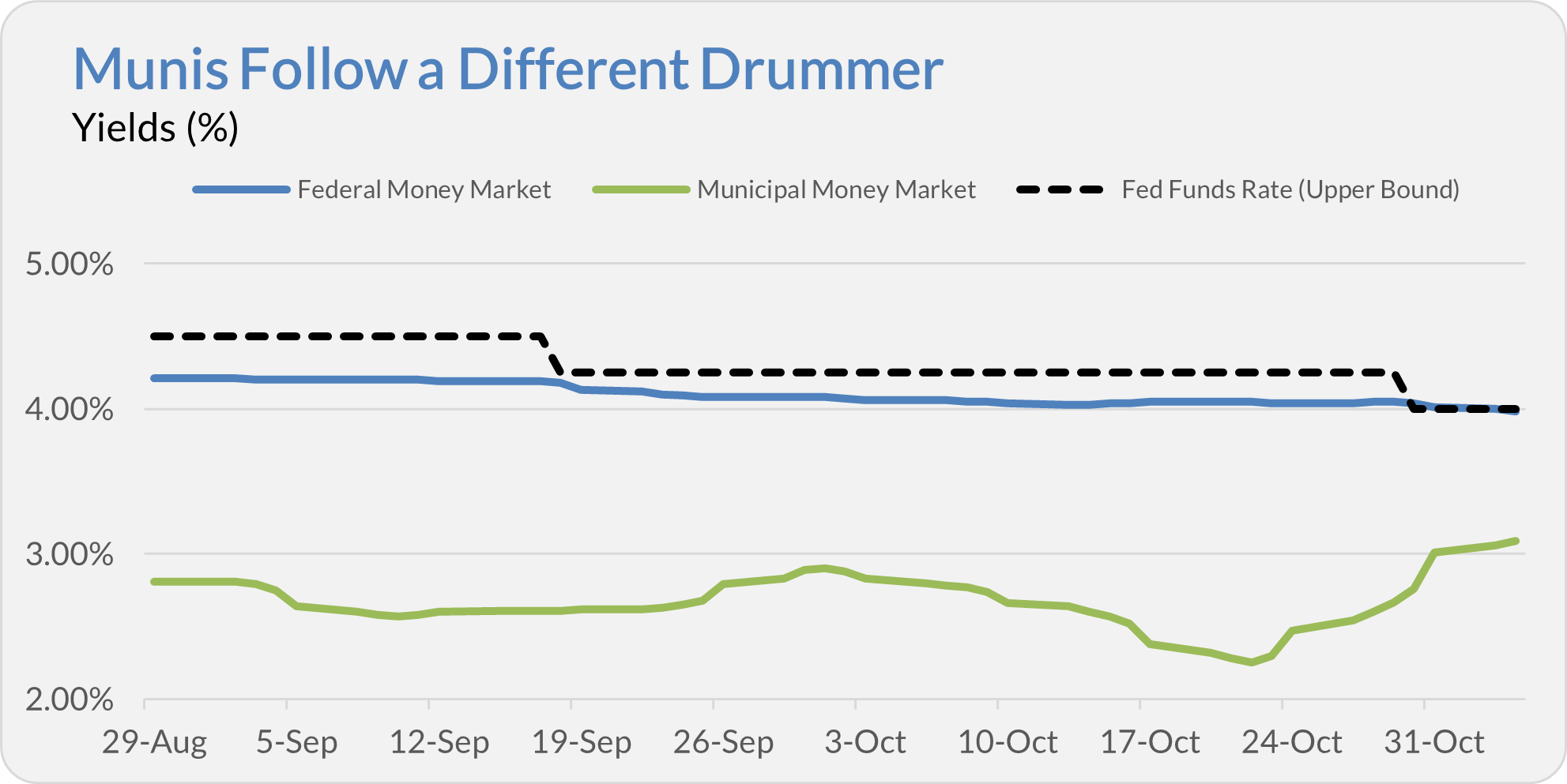 When Fed officials eased policy in September, Municipal Money Market’s yield stood at 2.61%. It then rose to 2.90%, fell to 2.25% in mid-October, and has since climbed to 3.09%. In other words, the cash fund’s yield is now higher than it was before the Fed cut interest rates twice.