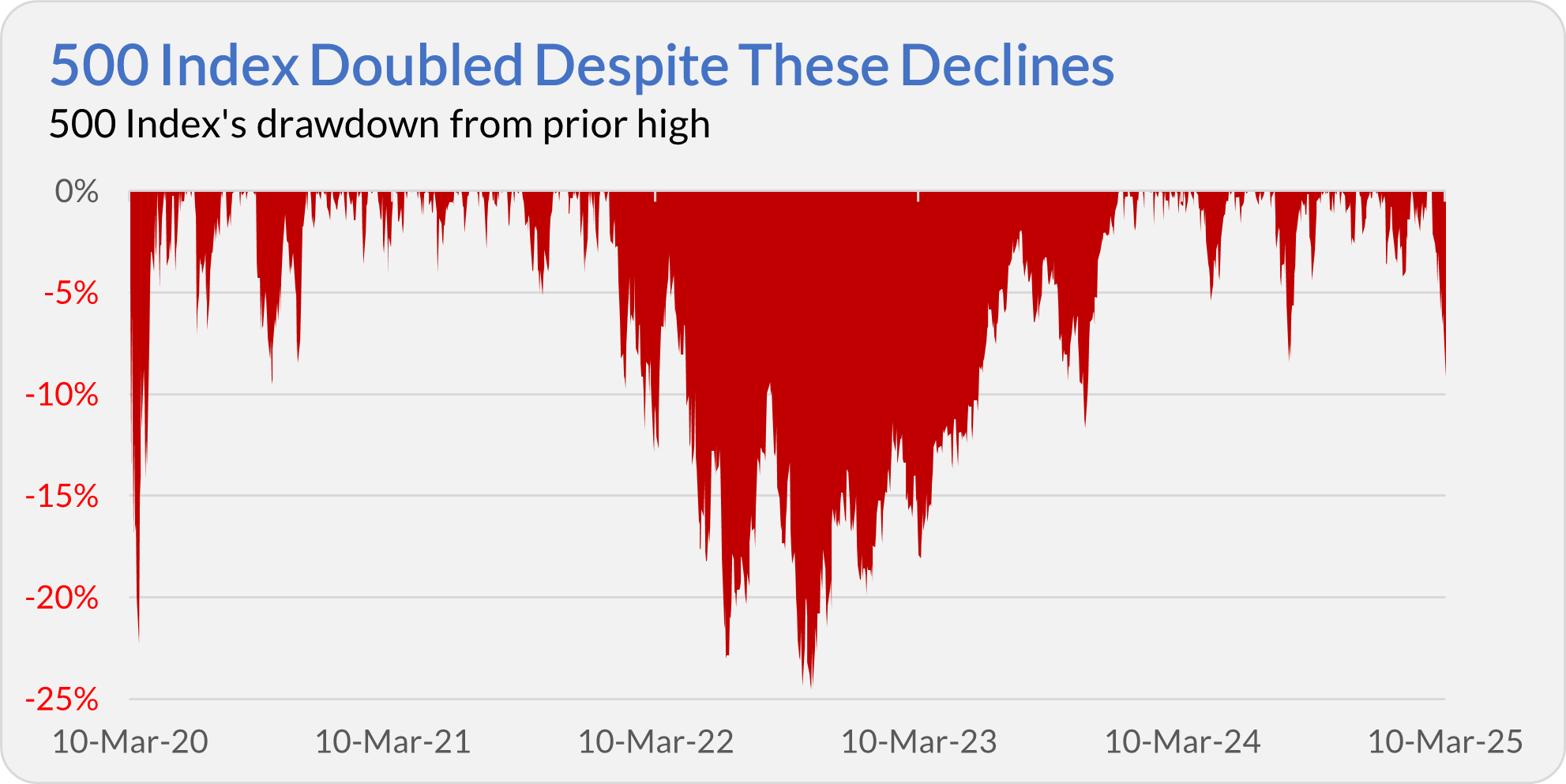 However, if you held on, you’d have doubled your money since your initial ill-timed purchase. 500 Index has gained 109% between March 10, 2020 and March 11, 2025—that includes the initial drop, the reflation bear market of 2022 and the recent market dip!