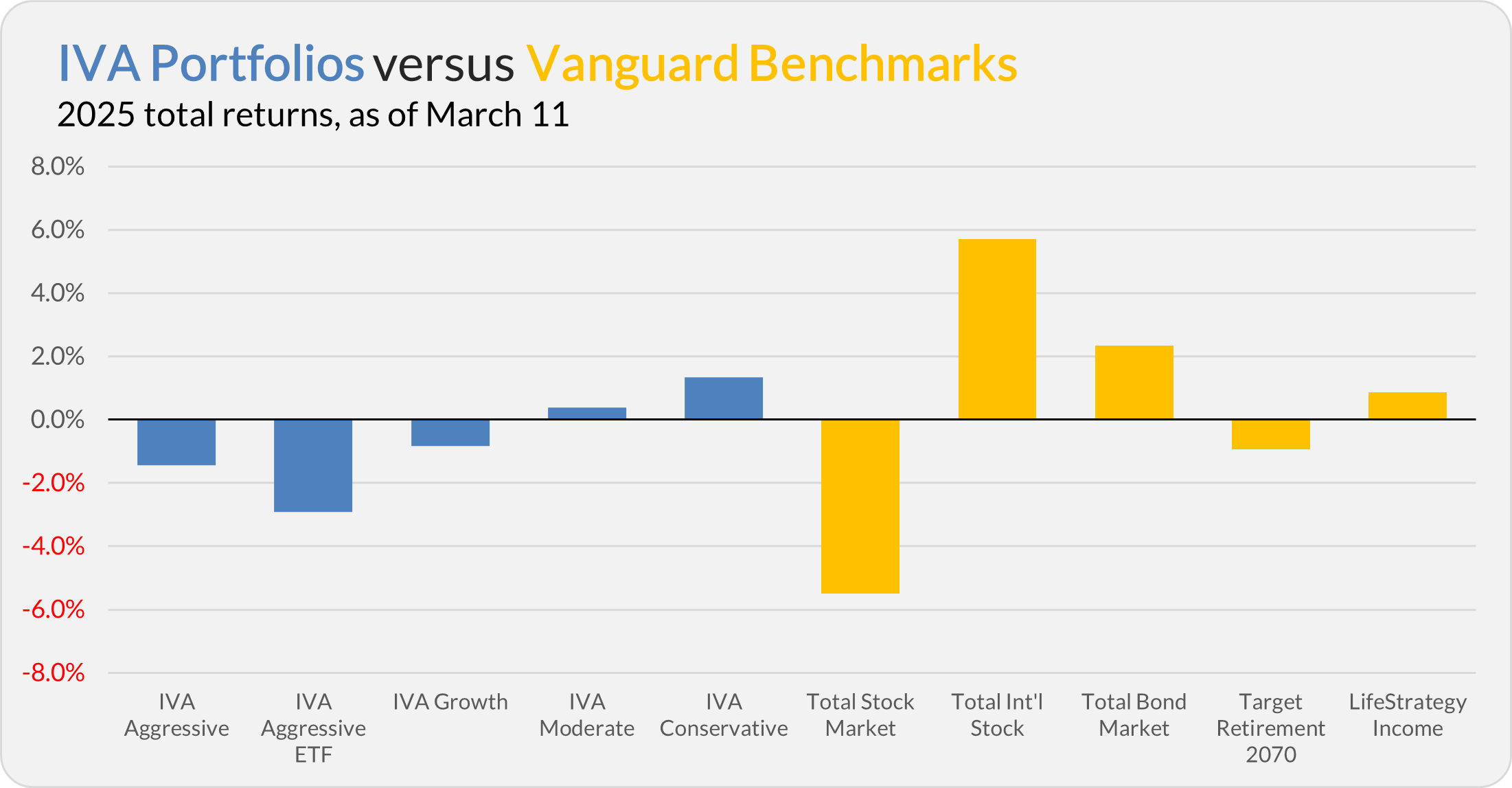This compares to a 5.5% decline for Total Stock Market Index (VTSAX), a 5.7% gain for Total International Stock Index (VTIAX), and a 2.3% return for Total Bond Market Index (VBTLX). Vanguard’s most aggressive multi-index fund, Target Retirement 2070 (VSNVX), is down 0.9% for the year, and its most conservative, LifeStrategy Income (VASIX), is up 0.9%.
