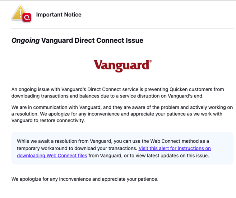 Unfortunately, for Quicken users, this being a Vanguard problem explains why it has persisted. Until it is resolved (and I'm not holding my breath), you'll need to download your transaction data and positions from Vanguard manually.