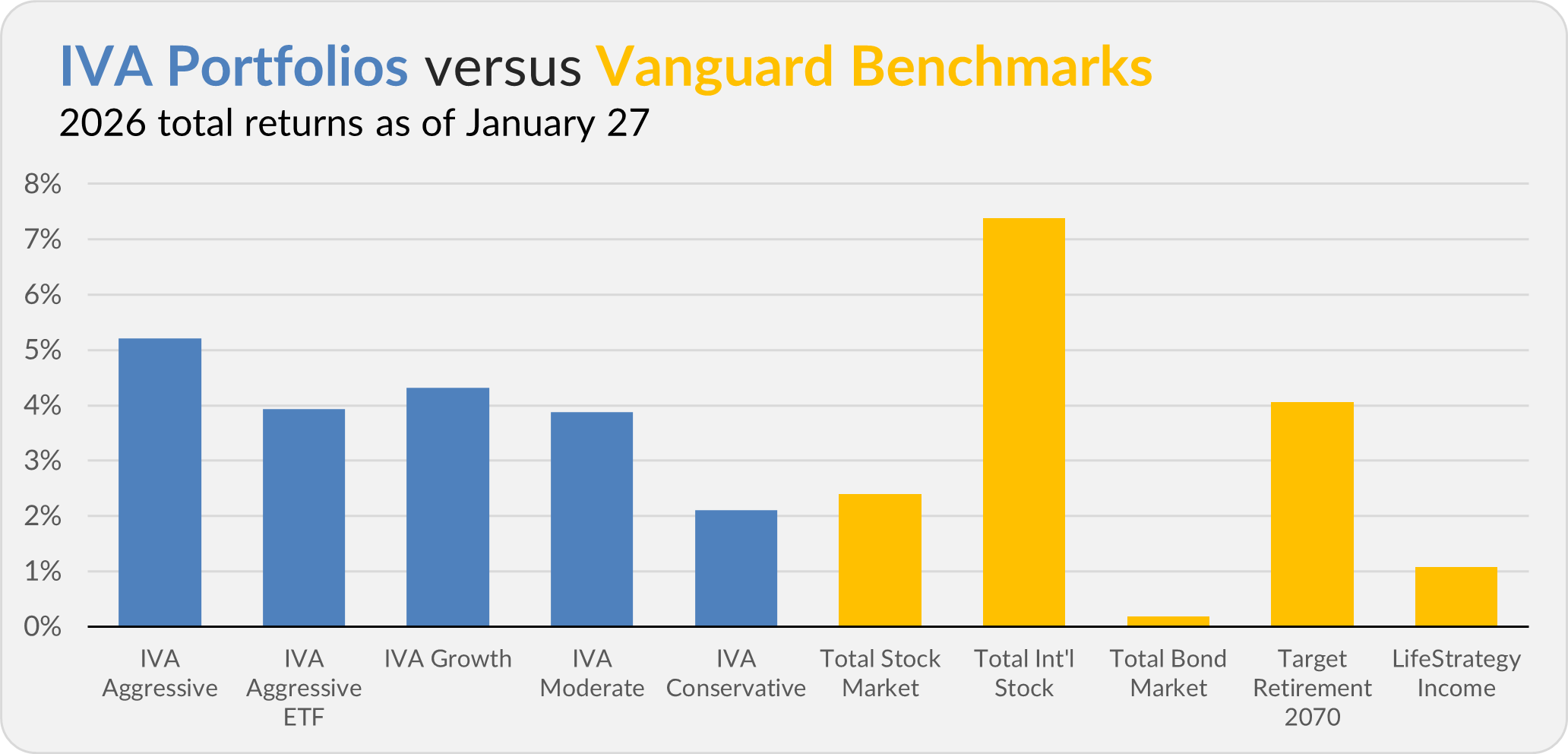 Gold crossed above $5,000 per ounce for the first time. Since the end of 2024, gold is up 97.0%, while 500 Index (VFIAX) has gained 20.2%. Foreign stocks, as measured by Total International Stock Index (VTIAX), are up 41.9% over that stretch.