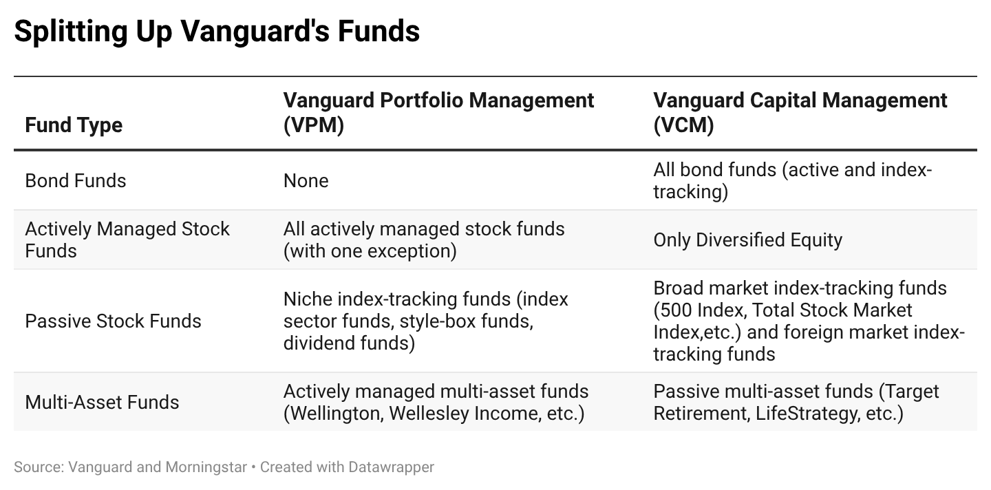 It’s official: On Monday, Vanguard completed its internal reorganization, splitting its investment operations into two units—Vanguard Capital Management (VCM) and Vanguard Portfolio Management (VPM).
