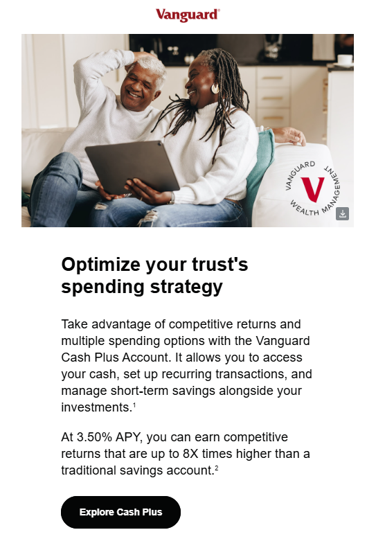Last week, I walked you through Vanguard’s aggressive marketing push for its Cash Plus Account. Turns out the campaign had more mileage left in it. On Thursday, an IVA reader shared an email promoting the account—and its headline 3.50% yield—specifically for his trust.