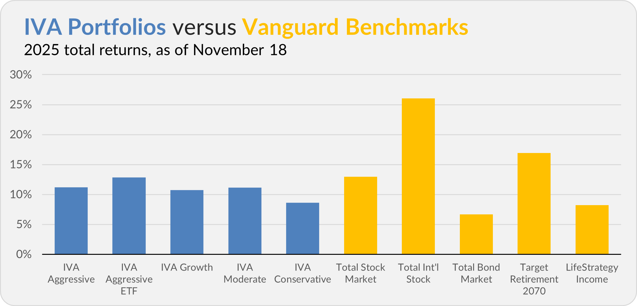 This compares to a 12.9% gain for Total Stock Market Index (VTSAX), a 26.0% return for Total International Stock Index (VTIAX), and a 6.7% gain for Total Bond Market Index (VBTLX). Vanguard’s most aggressive multi-index fund, Target Retirement 2070 (VSNVX), is up 16.9% for the year, and its most conservative, LifeStrategy Income (VASIX), is up 8.2%.