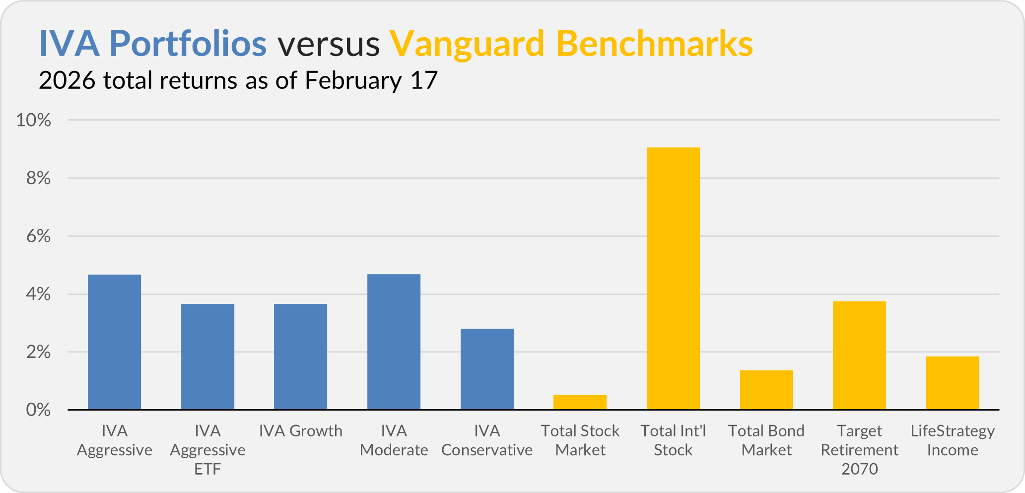 This compares to a 0.5% gain for Total Stock Market Index (VTSAX), a 9.1% return for Total International Stock Index (VTIAX), and a 1.4% gain for Total Bond Market Index (VBTLX). Vanguard’s most aggressive multi-index fund, Target Retirement 2070 (VSNVX), is up 3.7% for the year, and its most conservative, LifeStrategy Income (VASIX), is up 1.8%.