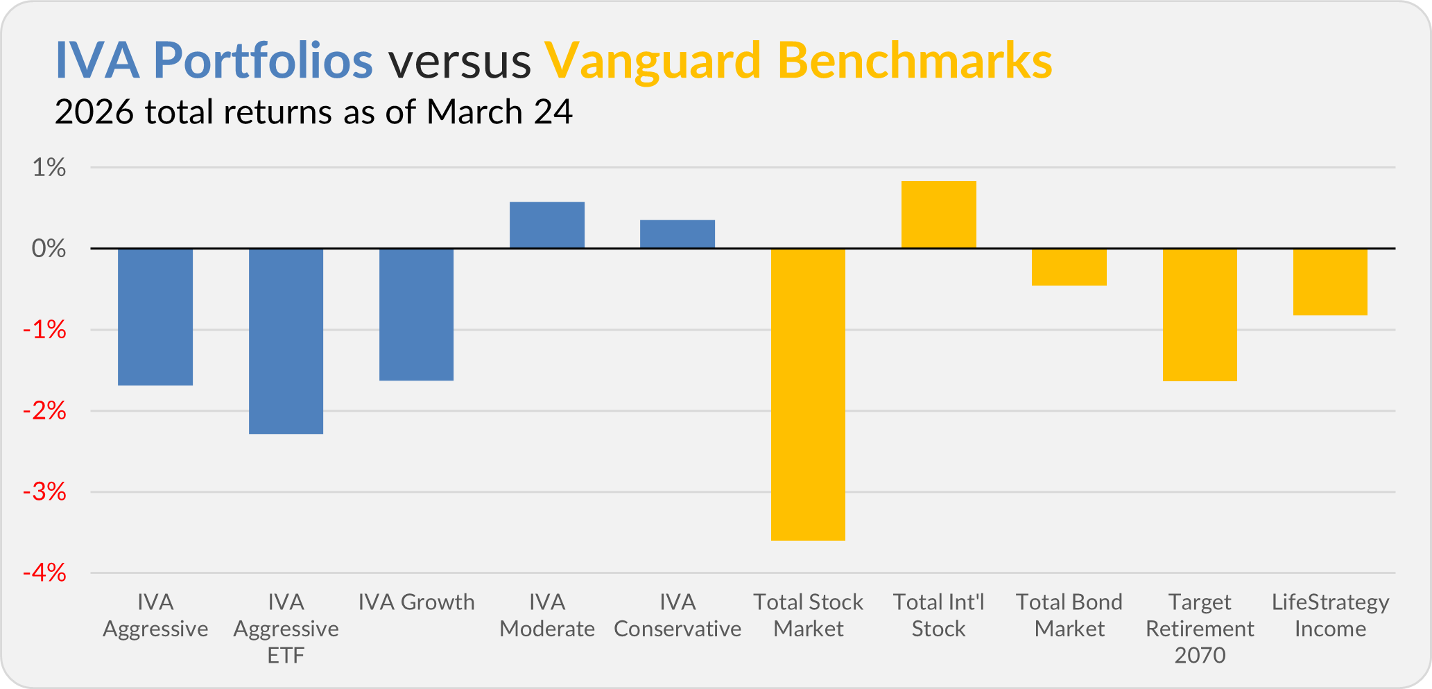 This compares to a 3.6% decline for Total Stock Market Index (VTSAX), a 0.8% gain for Total International Stock Index (VTIAX), and a 0.5% drop for Total Bond Market Index (VBTLX). Vanguard’s most aggressive multi-index fund, Target Retirement 2070 (VSNVX), is down 1.6% for the year, and its most conservative, LifeStrategy Income (VASIX), is down 0.8%.